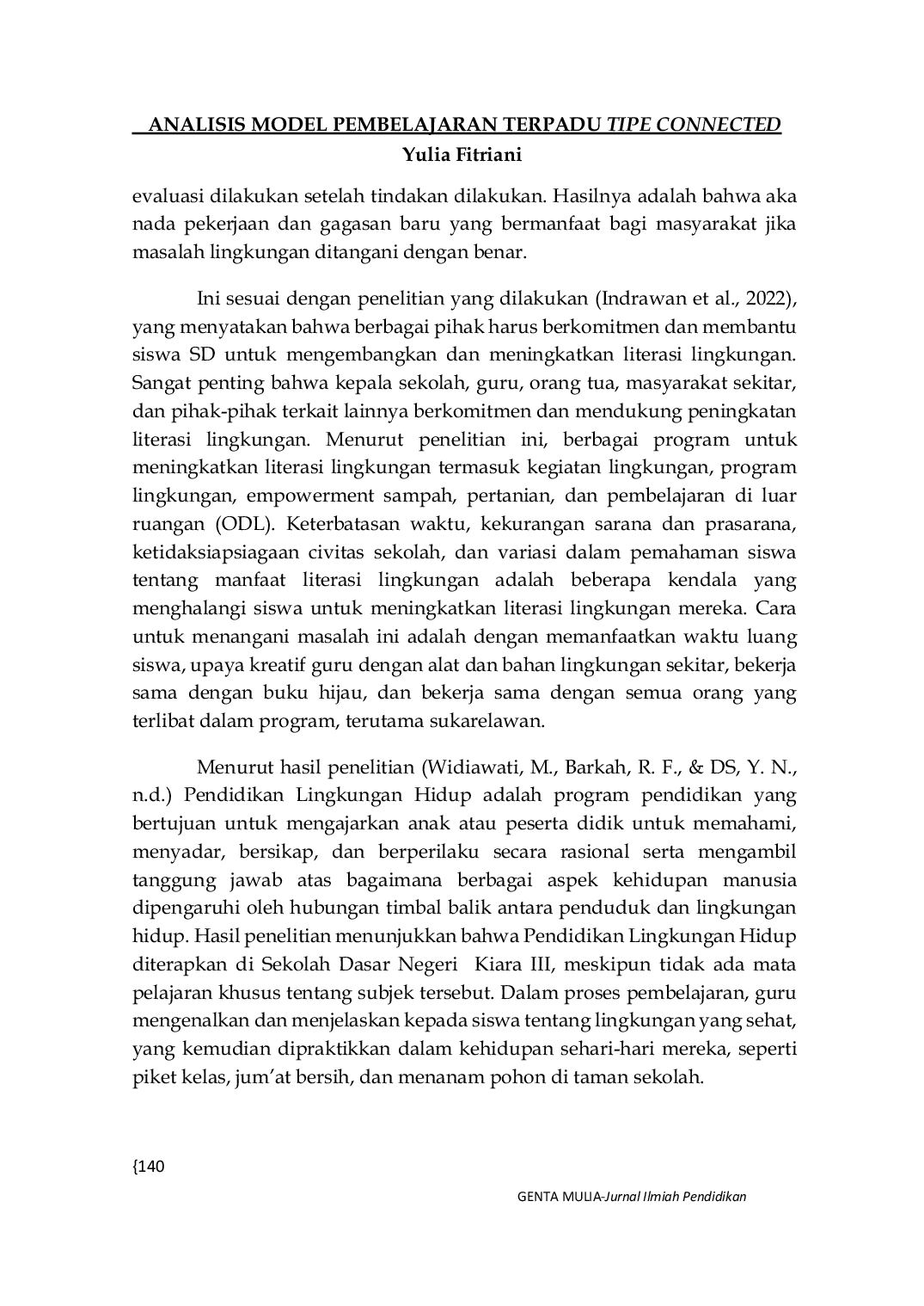 Jurnal Genta MuliaJurnal Genta MuliaKerusakan lingkungan saat ini telah menjadi masalah yang banyak dibicarakan dan dibahas di seluruh dunia. Faktor manusia adalah salah satu penyebab masalah lingkungan. Kepedulian masyarakat Indonesia terhadap lingkungan masih tergolong rendah. Rendahnya literasi lingkungan juga terjadi pada anak sekolah dasar. Penyebabnya adalah siswa kurang menjaga lingkungannya, misalnya dengan membuang sampah sembarangan, menancapkan tembok sekolah, merusak tanaman, tidak menjaga kebersihan kamar mandi, dan lain-lain, tanpa memikirkan dampak baiknya bagi diri sendiri dan lingkungannya. Diperlukan pengetahuan dan kesadaran akan pentingnya lingkungan serta perubahan sikap dan perilaku untuk menjaga lingkungan dalam diri seseorang, disebut literasi ekologi. Penyampaian informasi lingkungan dilakukan melalui pendidikan dan etika lingkungan.