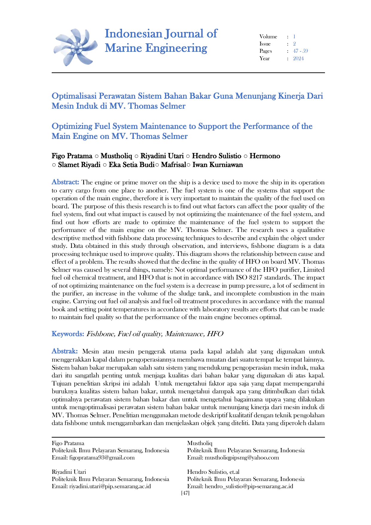 Indonesian Journal of Marine EngineeringIndonesian Journal of Marine EngineeringMesin atau mesin penggerak utama pada kapal adalah alat yang digunakan untuk menggerakkan kapal dalam pengoperasiannya membawa muatan dari suatu tempat ke tempat lainnya. Sistem bahan bakar merupakan salah satu sistem yang mendukung pengoperasian mesin induk, maka karena itu sangatlah penting untuk menjaga kualitas dari bahan bakar yang digunakan di atas kapal. Tujuan penelitian skripsi ini adalah untuk mengetahui faktor apa saja yang dapat mempengaruhi buruknya kualitas sistem bahan bakar, untuk mengetahui dampak apa yang ditimbulkan dari tidak optimalnya perawatan sistem bahan bakar dan untuk mengetahui bagaimana upaya yang dilakukan untuk mengoptimalisasi perawatan sistem bahan bakar untuk menunjang kinerja dari mesin induk di MV. Thomas Selmer. Penelitian menggunakan metode deskriptif kualitatif dengan teknik pengolahan data fishbone untuk menggambarkan dan menjelaskan objek yang diteliti. Data yang diperoleh dalam penelitian ini melalui observasi, dan wawancara, fishbone diagram adalah sebuah teknik pengolahan data yang digunakan untuk meningkatkan kualitas. Diagram ini menunjukan hubungan antara sebab dan akibat dari suatu permasalahan.