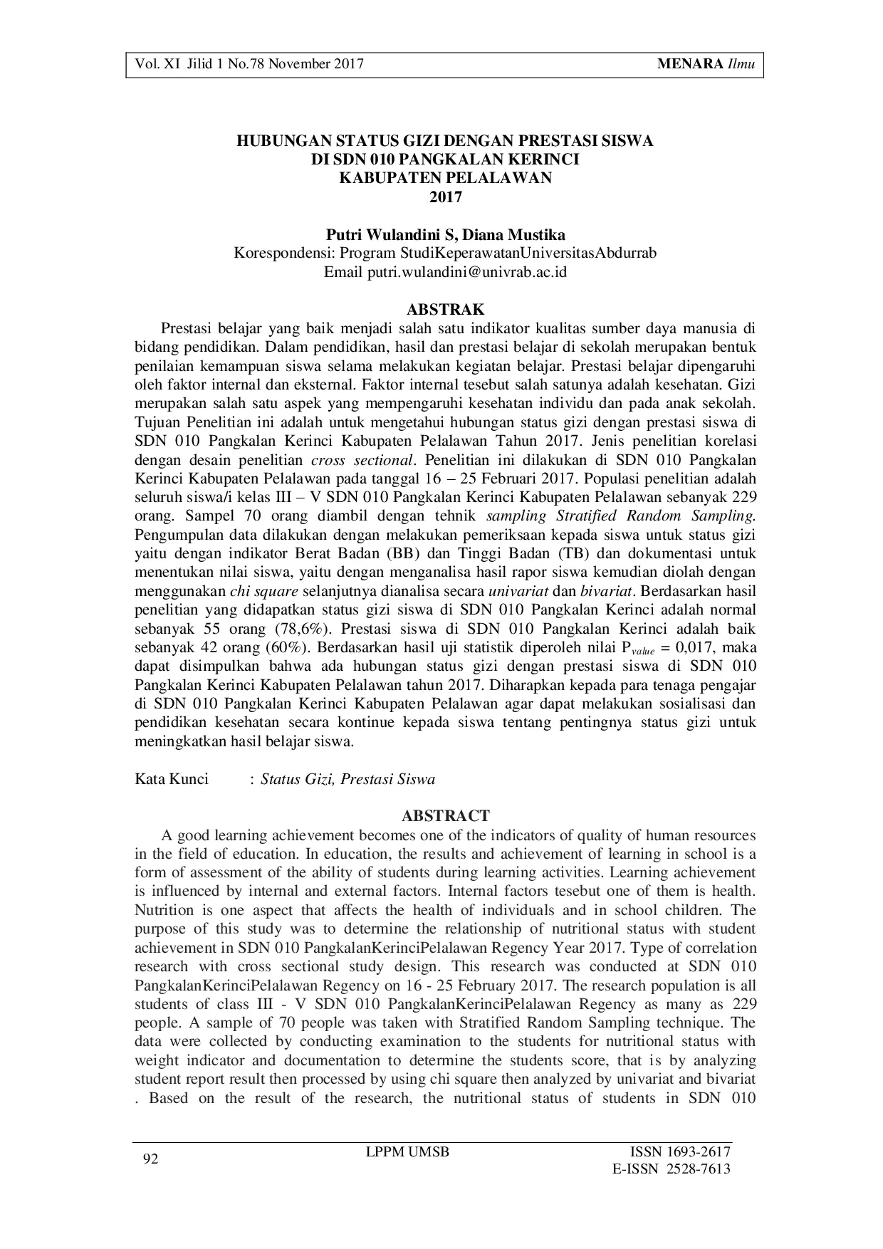Menara Ilmu : Jurnal Penelitian dan Kajian IlmiahMenara Ilmu : Jurnal Penelitian dan Kajian IlmiahPrestasi belajar yang baik menjadi salah satu indikator kualitas sumber daya manusia di bidang pendidikan. Dalam pendidikan, hasil dan prestasi belajar di sekolah merupakan bentuk penilaian kemampuan siswa selama melakukan kegiatan belajar. Prestasi belajar dipengaruhi oleh faktor internal dan eksternal. Faktor internal tesebut salah satunya adalah kesehatan. Gizi merupakan salah satu aspek yang mempengaruhi kesehatan individu dan pada anak sekolah. Tujuan Penelitian ini adalah untuk mengetahui hubungan status gizi dengan prestasi siswa di SDN 010 Pangkalan Kerinci Kabupaten Pelalawan Tahun 2017. Jenis penelitian korelasi dengan desain penelitian cross sectional. Penelitian ini dilakukan di SDN 010 Pangkalan Kerinci Kabupaten Pelalawan pada tanggal 16 – 25 Februari 2017. Populasi penelitian adalah seluruh siswa/i kelas III – V SDN 010 Pangkalan Kerinci Kabupaten Pelalawan sebanyak 229 orang. Sampel 70 orang diambil dengan tehnik sampling Stratified Random Sampling. Pengumpulan data dilakukan dengan melakukan pemeriksaan kepada siswa untuk status gizi yaitu dengan indikator Berat Badan (BB) dan Tinggi Badan (TB) dan dokumentasi untuk menentukan nilai siswa, yaitu dengan menganalisa hasil rapor siswa kemudian diolah dengan menggunakan chi square selanjutnya dianalisa secara univariat dan bivariat. Berdasarkan hasil penelitian yang didapatkan status gizi siswa di SDN 010 Pangkalan Kerinci adalah normal sebanyak 55 orang (78,6%). Prestasi siswa di SDN 010 Pangkalan Kerinci adalah baik sebanyak 42 orang (60%). Berdasarkan hasil uji statistik diperoleh nilai Pvalue = 0,017, maka dapat disimpulkan bahwa ada hubungan status gizi dengan prestasi siswa di SDN 010 Pangkalan Kerinci Kabupaten Pelalawan tahun 2017. Diharapkan kepada para tenaga pengajar di SDN 010 Pangkalan Kerinci Kabupaten Pelalawan agar dapat melakukan sosialisasi dan pendidikan kesehatan secara kontinue kepada siswa tentang pentingnya status gizi untuk meningkatkan hasil belajar siswa.
