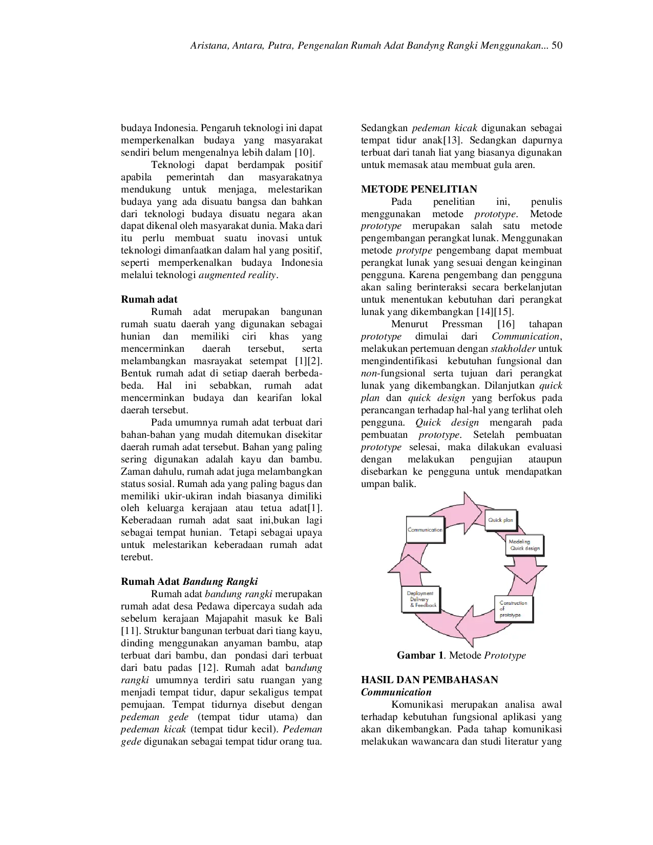 Jurnal Teknologi Informasi dan KomputerJurnal Teknologi Informasi dan KomputerRumah adat merupakan bangunan rumah suatu daerah yang khas mencerminkan daerah tersebut, serta melambangkan kebudayaan dan ciri khas masyarakat setempat. Saat ini, penggunaan rumah adat sebagai tempat tinggal mulai ditinggalkan. Begitu juga yang terjadi di Desa Pedawa, yang memiliki rumah adat yang disebut dengan rumah adat bandung rangki. Keberadaan rumah adat bandung rangki semakin ditinggalkan dan dilupakan. Rumah adat bandung rangki sangat perlu untuk dilestarikan dan diperkenalkan ke generasi muda. Agar keberadaan rumah adat bandung rangki tidak hilang dan terlupakan. Kehilangan rumah adat dapat berdampak hilangnya identitas budaya masyarakat setempat. Salah satu cara yang bisa dilakukan untuk melestarikan dan memperkenalkan rumah adat adalah dengan menggunakan Augmented Reality. Penggunaan augmented reality dianggap lebih interaktif dan menarik. Penelitian ini menggunakan metode prototype yang terdiri dari beberapa tahapan yaitu communication, quick plan and modeling quick design, constraction of prototype, development delivery and feedback. Hasil pengujian menggunakan metode black box, aplikasi dapat berjalan dengan lancar sesuai yang diharapkan.