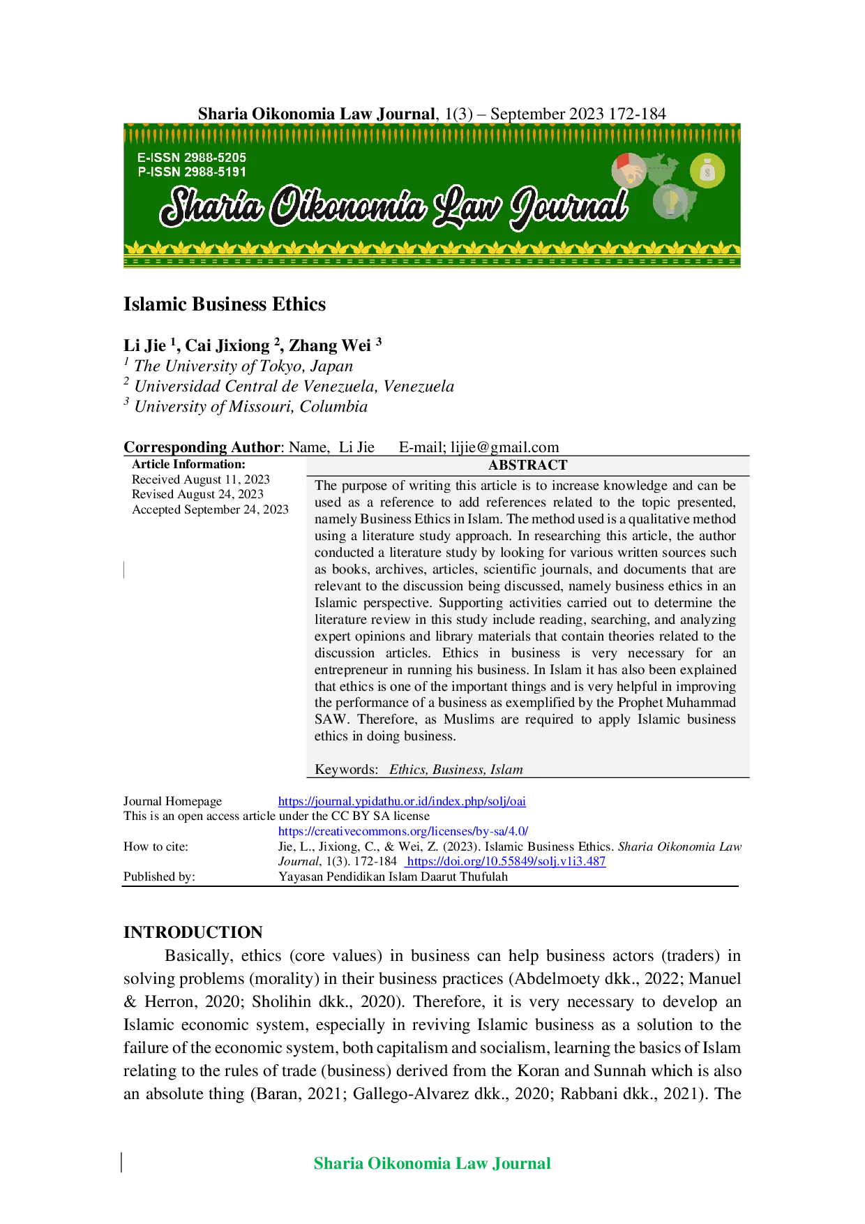 Sharia Oikonomia Law JournalSharia Oikonomia Law JournalTujuan penulisan artikel ini adalah untuk meningkatkan pengetahuan serta dapat dijadikan referensi dalam menambah literatur terkait topik yang dibahas, yaitu Etika Bisnis dalam Islam. Metode yang digunakan adalah metode kualitatif dengan pendekatan studi literatur. Penulis melakukan studi literatur dengan mencari berbagai sumber tertulis seperti buku, arsip, artikel, jurnal ilmiah, dan dokumen yang relevan dengan pembahasan etika bisnis dalam perspektif Islam. Kegiatan pendukung yang dilakukan untuk menyusun tinjauan pustaka meliputi membaca, mencari, dan menganalisis pendapat pakar serta materi perpustakaan yang memuat teori‑teori terkait. Etika dalam bisnis sangat diperlukan bagi pengusaha dalam menjalankan usahanya, dan dalam Islam etika juga dijelaskan sebagai salah satu hal penting yang dapat meningkatkan kinerja bisnis sebagaimana yang dicontohkan oleh Nabi Muhammad SAW. Oleh karena itu, umat Muslim diharapkan menerapkan etika bisnis Islam dalam aktivitas perdagangan mereka.