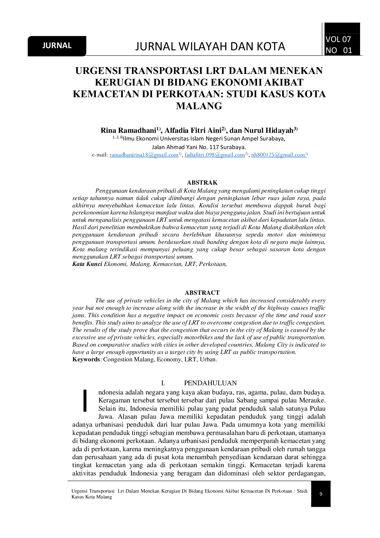 Studi literatur dan perbandingan dengan sistem LRT di Utah menunjukkan bahwa LRT dapat berfungsi sebagai moda transportasi massal yang meningkatkan daya tarik pariwisata Kota Malang sekaligus menyediakan layanan transportasi umum yang sederhana dan aman.Kemacetan di kota tersebut menimbulkan eksternalitas ekonomi negatif, menghambat pendapatan masyarakat dan distribusi barang.Oleh karena itu, penerapan LRT di Kota Malang dianggap layak untuk mengurangi kemacetan dan memperbaiki mobilitas urban.
