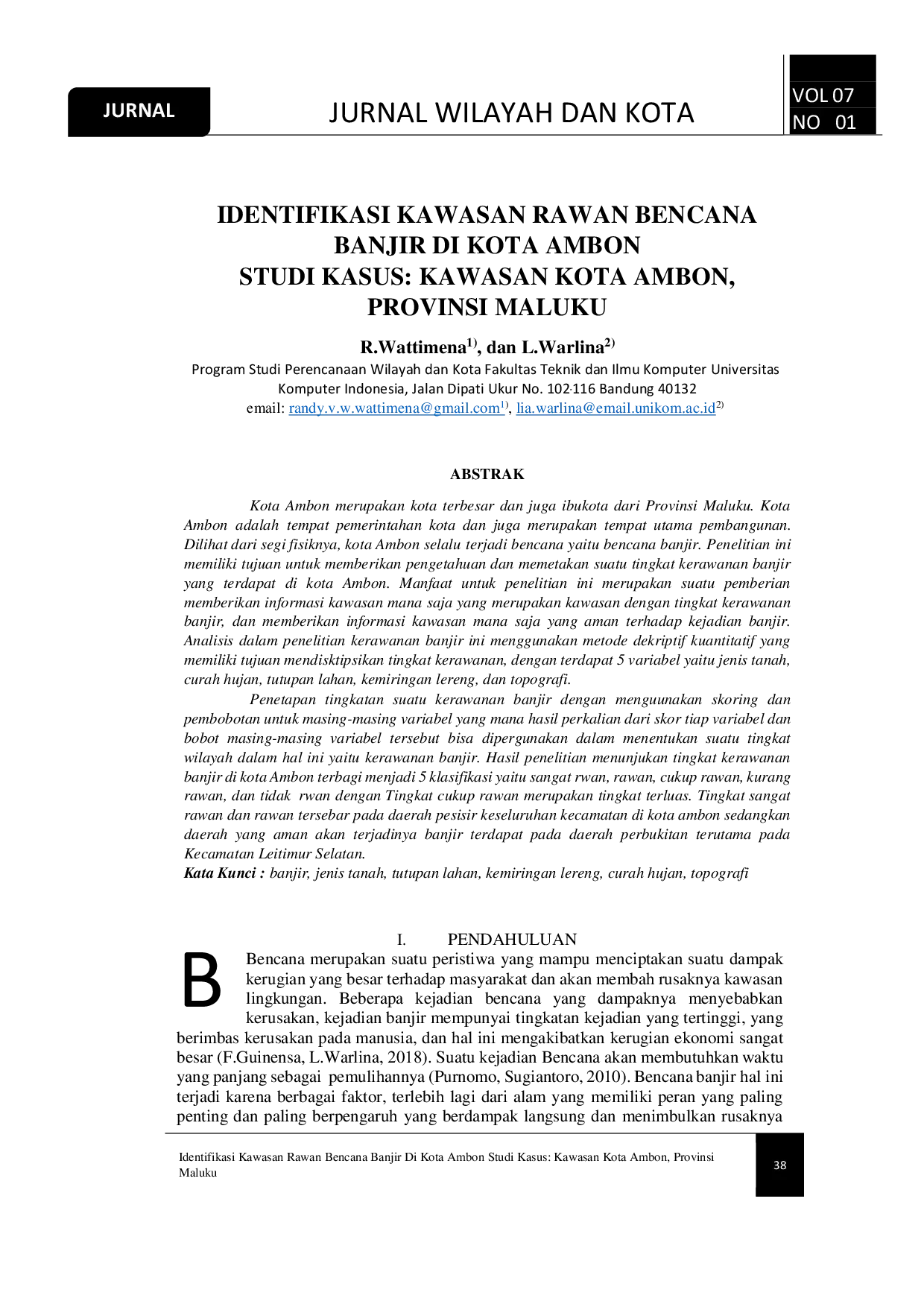 Jurnal Wilayah dan KotaJurnal Wilayah dan KotaKota Ambon merupakan kota terbesar dan juga ibukota dari Provinsi Maluku. Kota Ambon adalah tempat pemerintahan kota dan juga merupakan tempat utama pembangunan. Dilihat dari segi fisiknya, kota Ambon selalu terjadi bencana yaitu bencana banjir. Penelitian ini memiliki tujuan untuk memberikan pengetahuan dan memetakan suatu tingkat kerawanan banjir yang terdapat di kota Ambon. Manfaat untuk penelitian ini merupakan suatu pemberian informasi kawasan mana saja yang merupakan kawasan dengan tingkat kerawanan banjir, dan memberikan informasi kawasan mana saja yang aman terhadap kejadian banjir. Analisis dalam penelitian kerawanan banjir ini menggunakan metode dekriptif kuantitatif yang memiliki tujuan mendisktipsikan tingkat kerawanan, dengan terdapat 5 variabel yaitu jenis tanah, curah hujan, tutupan lahan, kemiringan lereng, dan topografi. Penetapan tingkatan suatu kerawanan banjir dengan menguunakan skoring dan pembobotan untuk masing-masing variabel yang mana hasil perkalian dari skor tiap variabel dan bobot masing-masing variabel tersebut bisa dipergunakan dalam menentukan suatu tingkat wilayah dalam hal ini yaitu kerawanan banjir. Hasil penelitian menunjukan tingkat kerawanan banjir di kota Ambon terbagi menjadi 5 klasifikasi yaitu sangat rawan, rawan, cukup rawan, kurang rawan, dan tidak rawan dengan Tingkat cukup rawan merupakan tingkat terluas. Tingkat sangat rawan dan rawan tersebar pada daerah pesisir keseluruhan kecamatan di kota ambon sedangkan daerah yang aman akan terjadinya banjir terdapat pada daerah perbukitan terutama pada Kecamatan Leitimur Selatan.