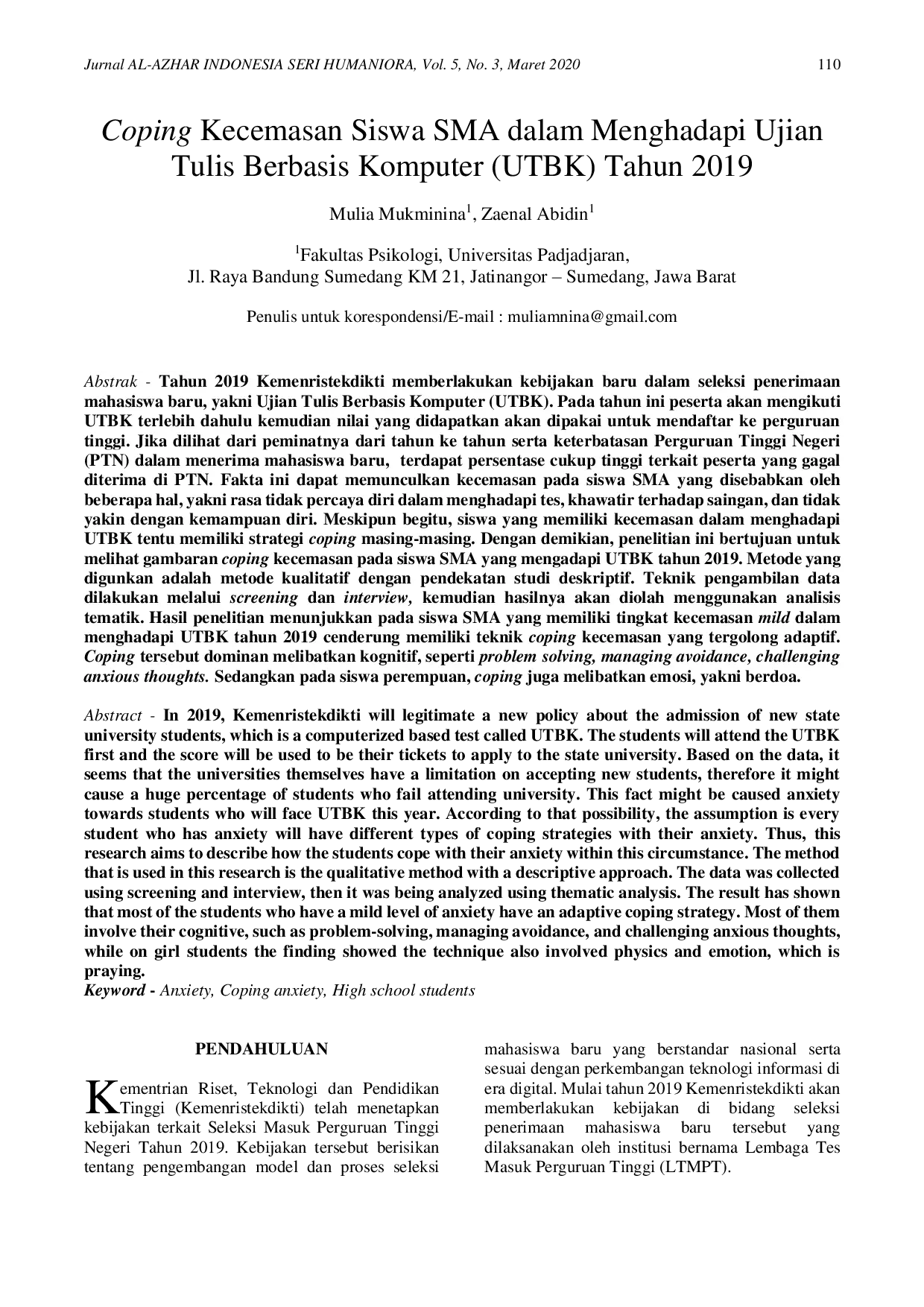 JURNAL Al-AZHAR INDONESIA SERI HUMANIORAJURNAL Al-AZHAR INDONESIA SERI HUMANIORATahun 2019, Kemenristekdikti memberlakukan kebijakan baru dalam seleksi penerimaan mahasiswa baru, yaitu Ujian Tulis Berbasis Komputer (UTBK). Peserta akan mengikuti UTBK terlebih dahulu, kemudian nilai yang didapatkan akan digunakan untuk mendaftar ke perguruan tinggi. Mengingat tingginya minat peserta dan keterbatasan Perguruan Tinggi Negeri (PTN) dalam menerima mahasiswa baru, terdapat persentase yang cukup tinggi terkait peserta yang gagal diterima di PTN. Fakta ini dapat memunculkan kecemasan pada siswa SMA yang disebabkan oleh beberapa hal, yaitu rasa tidak percaya diri dalam menghadapi tes, khawatir terhadap saingan, dan tidak yakin dengan kemampuan diri. Penelitian ini bertujuan untuk melihat gambaran coping kecemasan pada siswa SMA yang menghadapi UTBK tahun 2019. Metode yang digunakan adalah metode kualitatif dengan pendekatan studi deskriptif. Hasil penelitian menunjukkan bahwa siswa SMA yang memiliki tingkat kecemasan ringan dalam menghadapi UTBK tahun 2019 cenderung memiliki teknik coping kecemasan yang tergolong adaptif, melibatkan kognitif seperti problem solving, managing avoidance, dan challenging anxious thoughts. Pada siswa perempuan, coping juga melibatkan emosi, yaitu berdoa.