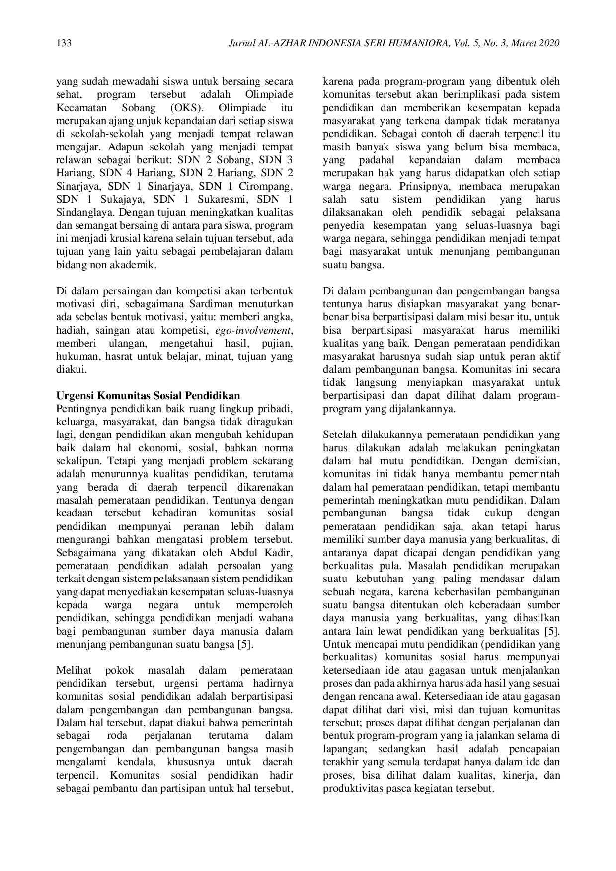 JURNAL Al-AZHAR INDONESIA SERI HUMANIORAJURNAL Al-AZHAR INDONESIA SERI HUMANIORAPendidikan adalah sebuah proses manusia baik individu atau masyarakat untuk menuju kehidupan yang ideal dan lebih baik. Pendidikan yang akan mengubah menuju ke arah yang lebih baik adalah pendidikan yang kualitasnya baik pula. Namun, melihat realitas sekarang, kualitas pendidikan di Indonesia masih rendah apalagi dalam hal pemerataan pendidikan, di antaranya: fasilitas, akses, dan tenaga pengajar yang akan berimplikasi pada proses belajar dan hasil belajar. Keadaan tersebut salah satunya gambaran pendidikan yang ada di daerah terpencil. Dengan demikian, penelitian ini akan berfokus pada masalah pemerataan pendidikan di daerah terpencil dengan cara mengoptimalkan komunitas sobat mengajar sebagai gerakan sosial pendidikan. Komunitas ini bergerak di daerah-daerah terpencil khususnya di Kabupaten Lebak, Provinsi Banten, kajian awal mencari data keadaan pendidikan di daerah tersebut dengan cara membaca literature dan wawancara langsung kepada relawan sobat mengajar kemudian hasilnya dideskripsikan, dengan demikian penelitian ini menggunakan metode deskriptif kualitatif. Untuk mengatasi tidak meratanya pendidikan di Indonesia ada beberapa langkah yang harus dilakukan: pertama, mengoptimalkan gerakan sosial pendidikan. Kedua, melakukan program yang mengedukasi masyarakat. Ketiga, harus melibatkan masyarakat dalam semua program.