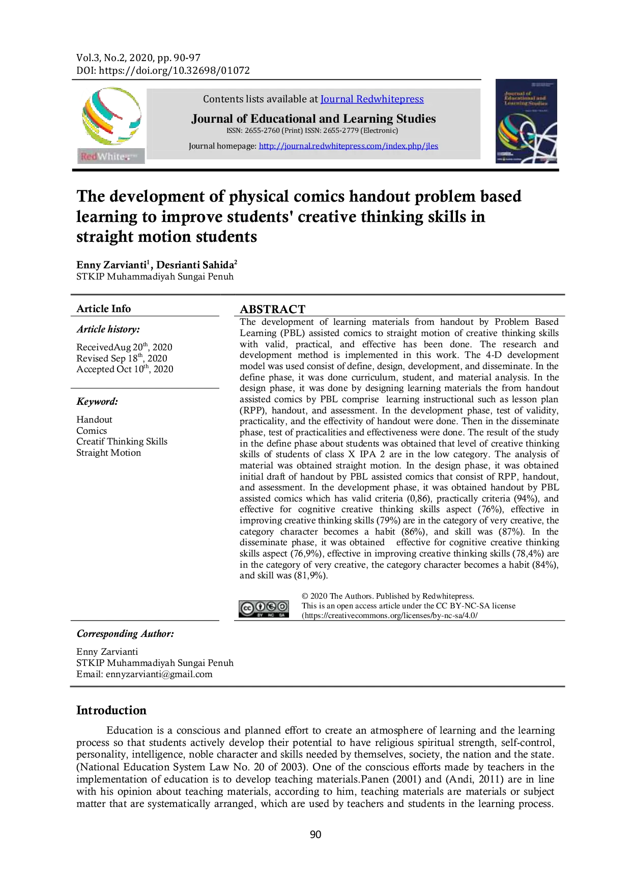 Journal of Educational and Learning StudiesJournal of Educational and Learning StudiesPenelitian ini mengembangkan media pembelajaran berupa handout berbasis komik yang dipadukan dengan Problem Based Learning (PBL) untuk materi gerak lurus, dengan tujuan meningkatkan kemampuan berpikir kreatif siswa. Model pengembangan 4-D (Define, Design, Develop, Disseminate) digunakan; fase Define mencakup analisis kurikulum, siswa, dan materi, fase Design menghasilkan RPP, handout, dan instrumen penilaian, fase Develop menguji validitas, praktikalitas, dan efektivitas, sedangkan fase Disseminate menguji kembali praktikalitas dan efektivitas handout. Hasil pengujian menunjukkan handout memiliki validitas tinggi (Aikens V = 0,86), praktikalitas 94 %, serta meningkatkan kemampuan berpikir kreatif secara signifikan (peningkatan rata‑rata nilai kreatifitas sebesar 76‑79 %).