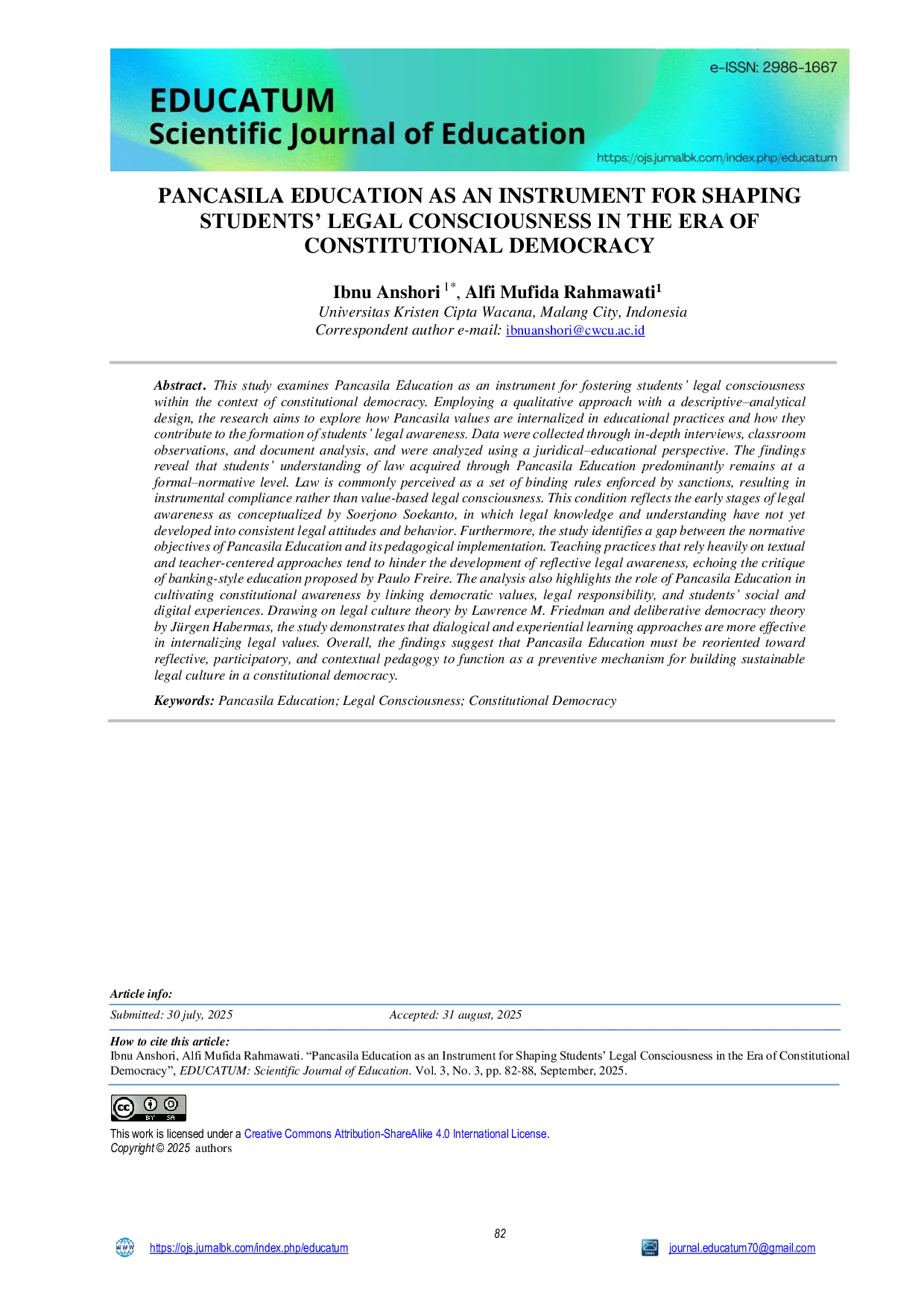 - Pancasila as a Foundation for Legal Reform: Evaluating the Impact of Civic Education on Indonesian Legal... doi.org/10.15294/jllr.v5i3.16498Pancasila as a Foundation for Legal Reform Evaluating the Impact of Civic Education on Indonesian Legal doi 10 15294 jllr v5i3 16498