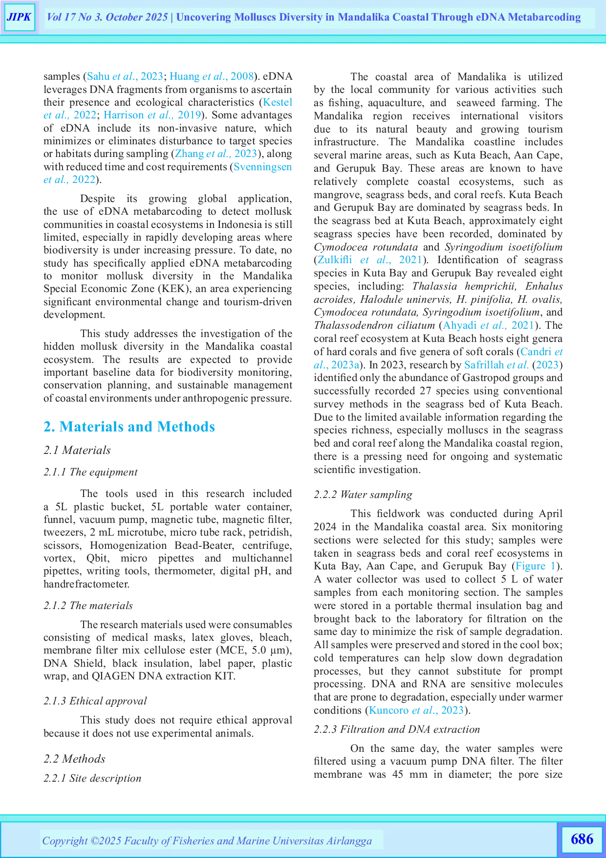 Jurnal Ilmiah Perikanan dan KelautanJurnal Ilmiah Perikanan dan KelautanMolluscs are one of the main taxa in coastal ecosystems that play an important role in the food chain, bioindicators, and have high economic value. However, the limitations of conventional methods in detecting species that live hidden in complex ecosystems, such as seagrass and coral reefs, are a challenge in biodiversity monitoring. This study aimed to explore the diversity of mollusc species in the Mandalika coastal area using an eDNA metabarcoding approach. This study used the environmental DNA (eDNA) metabarcoding method to identify the diversity of molluscs in the coastal ecosystem of Mandalika, Central Lombok. The sites including Kuta Beach, Gerupuk Bay, and Aan Cape along the Mandalika coastal that contain both seagrass bed and coral reef ecosystems. Two samples were taken from each site in both the seagrass bed and coral reef ecosystems. Analysis of six water samples resulted in 99 ASVs and 116,611 final sequences, with 10 ASVs (50,960 sequences) identified as Mollusca taxa, all from the Gastropoda class. Four species were successfully identified, including Monetaria sp. M. obvelata, M. annulus and Phyllaplysia sp. that had not previously been reported through direct observation or conventional identification methods in Mandalika coastal area. Species diversity varied between locations and was influenced by environmental factors such as temperature, pH, salinity, phosphate, and anthropogenic pressure. These results show that eDNA metabarcoding is an effective tool in detecting mollusc species, even in hard-to-reach habitats, and support the urgency of scientific data-based mollusc conservation management.