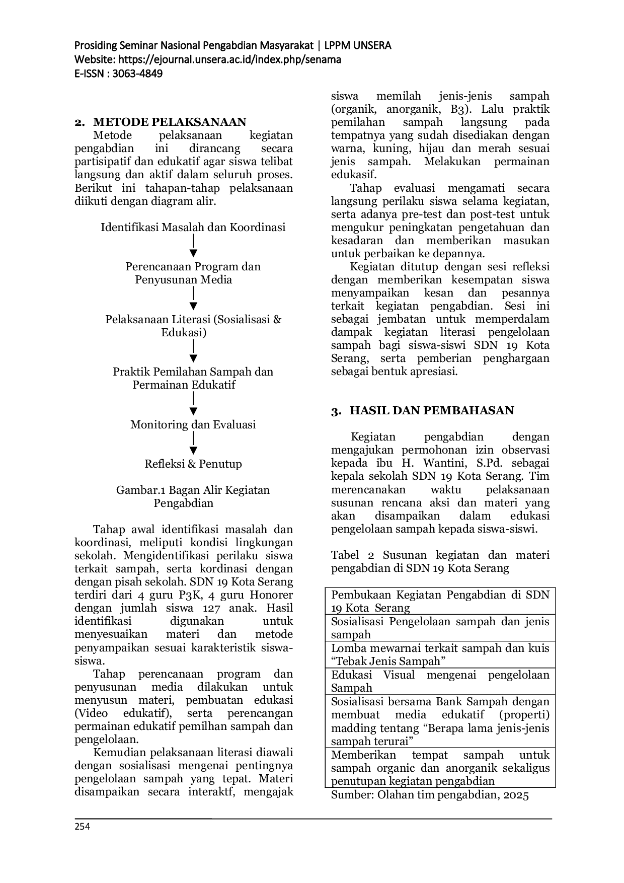 Seminar Nasional Pengabdian MasyarakatSeminar Nasional Pengabdian MasyarakatKegiatan pengabdian masyarakat ini bertujuan meningkatkan literasi pengelolaan sampah pada siswa-siswa kelas tinggi SDN 19 Kota Serang sebagai upaya membentuk kesadaran lingkungan sejak dini. Berdasarkan hasil analisis situasi ditemukan bahwa masih rendah pemahaman anak-anak mengenai jenis sampah dan pengelolaannya menjadi salah satu penyumbang tingginya volume sampah di Kota Serang. Permasalahan ini belum teratasi dengan kurangnya media edukatif yang menarik serta keterbatasan keterlibatan aktif dari pihak sekolah dalam pengelolaan sampah. Metode yang digunakan dalam kegiatan ini adalah pendekatan partisipastif melalui edukasi interaktif, praktik memilah sampah, serta permainan edukatif bertema lingkungan. Hasil kegiatan menunjukkan adanya peningkatan dalam pemahaman siswa mengenai pentingnya pengelolaan sampah ditandai dengan meningkatkan dalam mengidentifikasi dan memilah sampah organik dan anorganik serta partisipasi aktif dalam menjaga kebersihan lingkungan sekolah. Pembahasan menekankan pentingnya kolaborasi antara guru, siswa dan masyarakat dalam membangun budaya sadar lingkungan melalui literasi pengelolaan sampah yang berkelanjutan. Kegiatan ini menjadi langkah awal dalam menanamkan nilai-nilai kepedulian yang diharapkan dapat terus berkembang dan diterapkan dalam kehidupan sehari-hari siswa.
