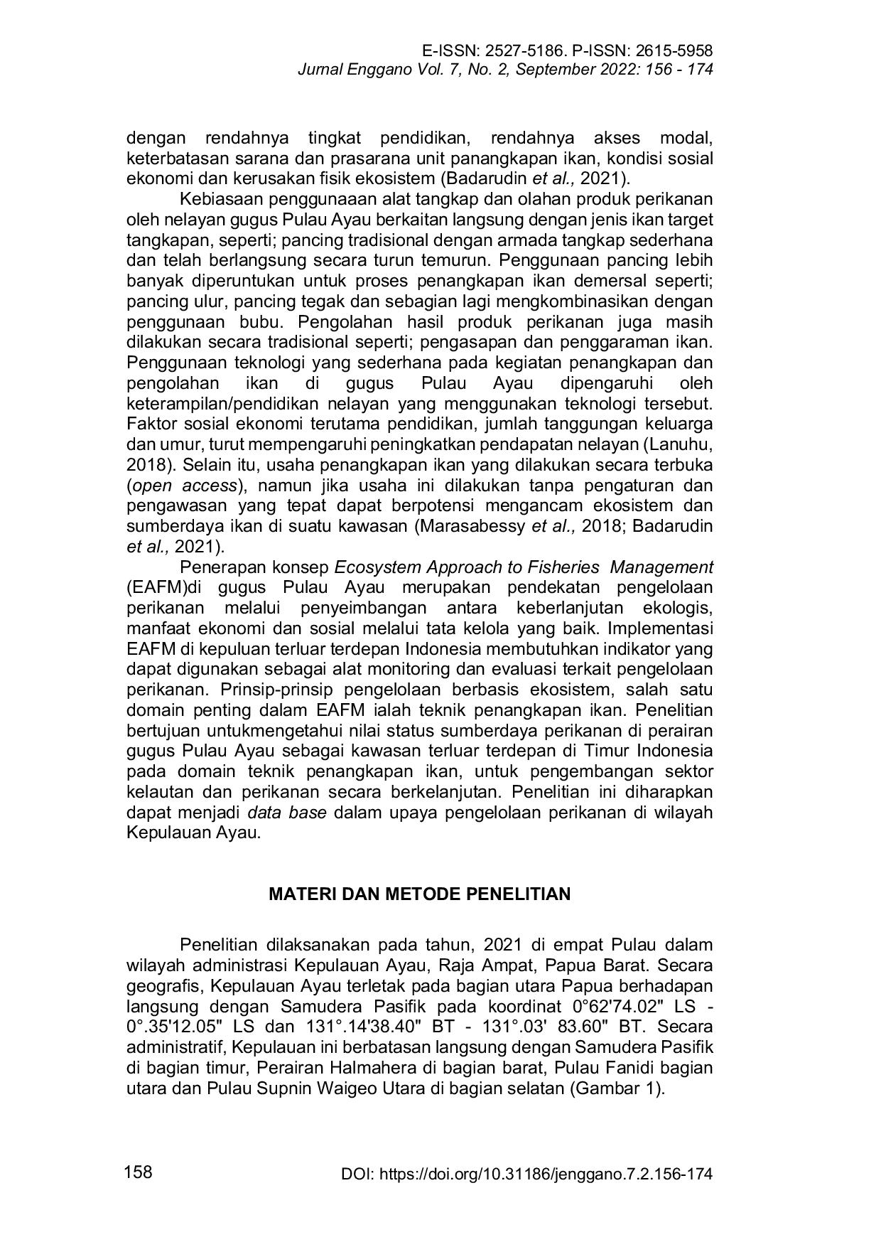 Jurnal EngganoJurnal EngganoPengelolaan dan pemanfaatan sumberdaya di pulau sangat kecil terluar, terdepan Negara Indonesia penting untuk menjamin peningkatan ekonomi masyarakat lokal dan keberlanjutan ekosistem. Penelitian bertujuan mengetahui nilai status sumberdaya perikanan di perairan gugus Pulau Ayau, Raja Ampat pada domain teknik penangkapan ikan. Penilaian status implementasi EAFM dilakukan dengan cara menjumlahkan nilai setiap kriteria, kemudian dibagi dengan jumlah indikator. Nilai skor indeks didapatkan dari rata-rata nilai flag model pada domain tersebut. Total nilai indeks yang diperoleh, selanjutnya dianalisis dengan menggunakan sistem multikriteria, membandingkan nilai indeks total semua atribut/indikator total maksimum. Analisis pemetaan menggunakan perangkat lunak Arcmap GIS 10.3.1, dibuat untuk memperoleh letak koordinat dan luas pulau. Hasil analisis nilai komposit EAFM pada domain ini sebesar 68.8%, yang mengindikasikan nilai skor rendah dengan indeks sebesar 315 dan 60. Atas dasar evidensi ini, maka pengelolaan perikanan skala kecil di gugus Pulau Ayau perlu mendapatkan perhatian khusus dalam upaya perbaikan tata kelola perikanan yang lebih baik.