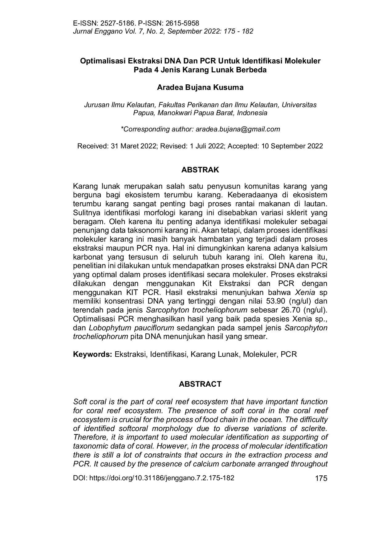 Jurnal EngganoJurnal EngganoKarang lunak merupakan salah satu penyusun komunitas karang yang berguna bagi ekosistem terumbu karang. Keberadaannya di ekosistem terumbu karang sangat penting bagi proses rantai makanan di lautan. Sulitnya identifikasi morfologi karang ini disebabkan variasi sklerit yang beragam. Oleh karena itu penting adanya identifikasi molekuler sebagai penunjang data taksonomi karang ini. Akan tetapi, dalam proses identifikasi molekuler karang ini masih banyak hambatan yang terjadi dalam proses ekstraksi maupun PCR nya. Hal ini dimungkinkan karena adanya kalsium karbonat yang tersusun di seluruh tubuh karang ini. Oleh karena itu, penelitian ini dilakukan untuk mendapatkan proses ekstraksi DNA dan PCR yang optimal dalam proses identifikasi secara molekuler. Proses ekstraksi dilakukan dengan menggunakan Kit Ekstraksi dan PCR dengan menggunakan KIT PCR. Hasil ekstraksi menunjukan bahwa Xenia sp memiliki konsentrasi DNA yang tertinggi dengan nilai 53.90 (ng/ul) dan terendah pada jenis Sarcophyton trocheliophorum sebesar 26.70 (ng/ul). Optimalisasi PCR menghasilkan hasil yang baik pada spesies Xenia sp., dan Lobophytum pauciflorum sedangkan pada sampel jenis Sarcophyton trocheliophorum pita DNA menunjukan hasil yang smear.