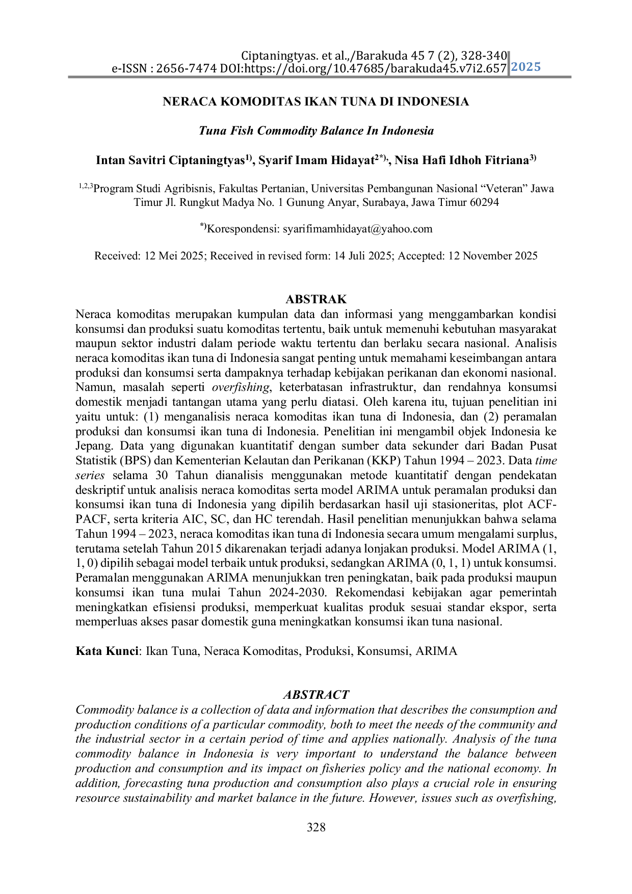 Barakuda 45: Jurnal Ilmu Perikanan dan KelautanBarakuda 45: Jurnal Ilmu Perikanan dan KelautanNeraca komoditas merupakan kumpulan data dan informasi yang menggambarkan kondisi konsumsi dan produksi suatu komoditas tertentu, baik untuk memenuhi kebutuhan masyarakat maupun sektor industri dalam periode waktu tertentu dan berlaku secara nasional. Analisis neraca komoditas ikan tuna di Indonesia sangat penting untuk memahami keseimbangan antara produksi dan konsumsi serta dampaknya terhadap kebijakan perikanan dan ekonomi nasional. Namun, masalah seperti overfishing, keterbatasan infrastruktur, dan rendahnya konsumsi domestik menjadi tantangan utama yang perlu diatasi. Oleh karena itu, tujuan penelitian ini yaitu untuk: (1) menganalisis neraca komoditas ikan tuna di Indonesia, dan (2) peramalan produksi dan konsumsi ikan tuna di Indonesia. Penelitian ini mengambil objek Indonesia ke Jepang. Data yang digunakan kuantitatif dengan sumber data sekunder dari Badan Pusat Statistik (BPS) dan Kementerian Kelautan dan Perikanan (KKP) Tahun 1994 – 2023. Data time series selama 30 Tahun dianalisis menggunakan metode kuantitatif dengan pendekatan deskriptif untuk analisis neraca komoditas serta model ARIMA untuk peramalan produksi dan konsumsi ikan tuna di Indonesia yang dipilih berdasarkan hasil uji stasioneritas, plot ACF-PACF, serta kriteria AIC, SC, dan HC terendah. Hasil penelitian menunjukkan bahwa selama Tahun 1994 – 2023, neraca komoditas ikan tuna di Indonesia secara umum mengalami surplus, terutama setelah Tahun 2015 dikarenakan terjadi adanya lonjakan produksi. Model ARIMA (1, 1, 0) dipilih sebagai model terbaik untuk produksi, sedangkan ARIMA (0, 1, 1) untuk konsumsi. Peramalan menggunakan ARIMA menunjukkan tren peningkatan, baik pada produksi maupun konsumsi ikan tuna mulai Tahun 2024-2030. Rekomendasi kebijakan agar pemerintah meningkatkan efisiensi produksi, memperkuat kualitas produk sesuai standar ekspor, serta memperluas akses pasar domestik guna meningkatkan konsumsi ikan tuna nasional.
