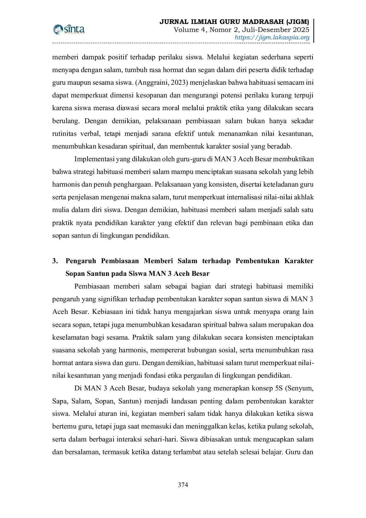Habituasi memberi salam terbukti menjadi strategi yang efektif dalam membentuk karakter sopan santun siswa di MAN 3 Aceh Besar.Pembiasaan yang dilakukan secara konsisten baik oleh guru maupun siswa menjadikan salam sebagai bagian integral dari budaya sekolah, sehingga nilai-nilai kesantunan dapat diinternalisasi secara alami dalam diri peserta didik.Melalui perencanaan yang jelas, keteladanan guru, serta penerapan aturan 5S (Senyum, Sapa, Salam, Sopan, Santun), siswa dibimbing untuk menunjukkan sikap hormat, ramah, dan menghargai sesama dalam setiap interaksi.