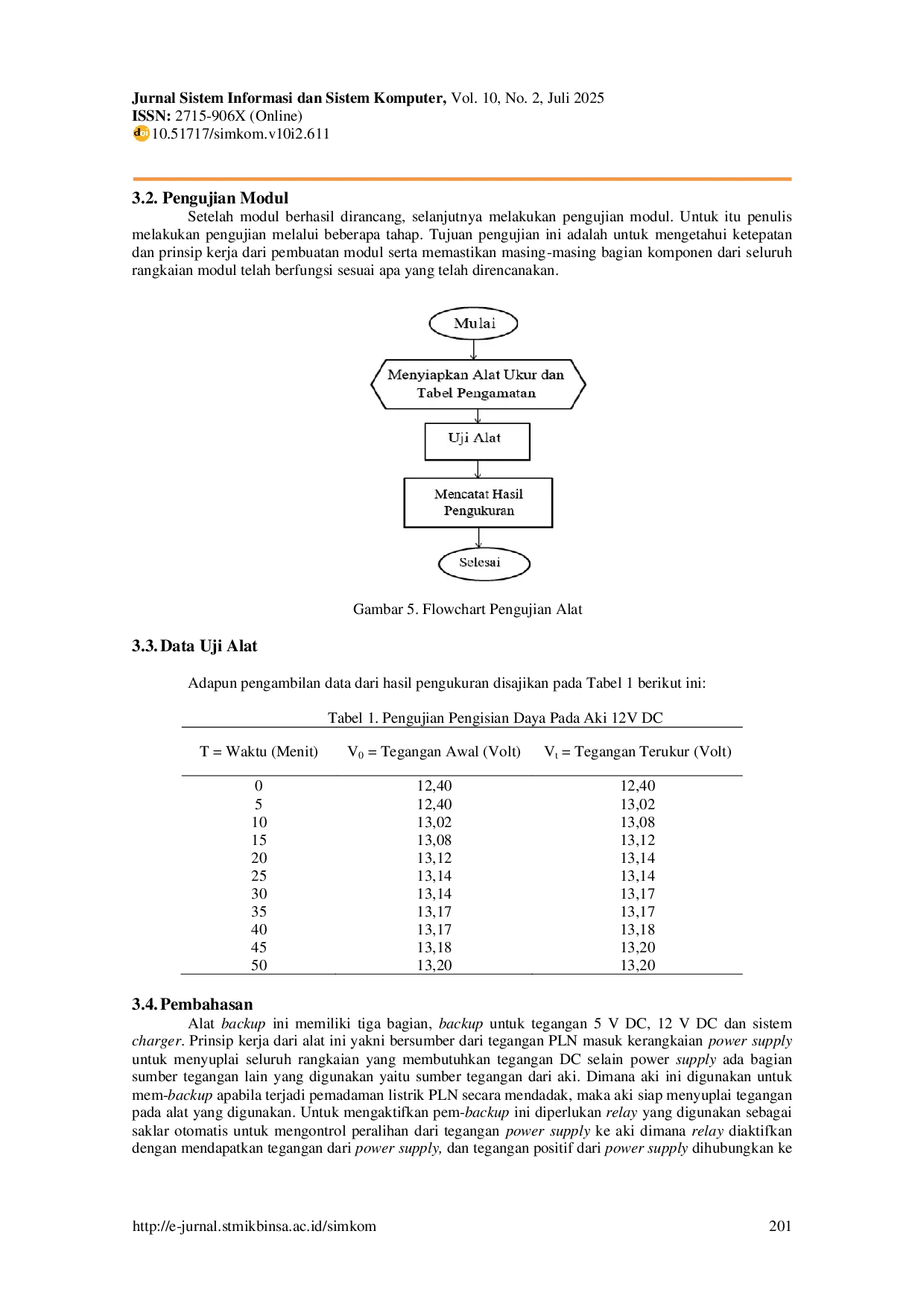Relay berfungsi mengendalikan pencadangan sumber tegangan dengan mengalihkan daya dari power supply ke aki saat terjadi pemadaman PLN secara tiba‑tiba.Charger secara otomatis menghentikan pengisian ketika aki mencapai 13,6 V DC dan kembali beroperasi setelah power supply dinyalakan kembali.Sistem mengalami restart yang mengembalikan pengaturan ke kondisi awal, namun hal ini dapat diatasi dengan menambahkan program EEPROM untuk menyimpan data pengaturan.