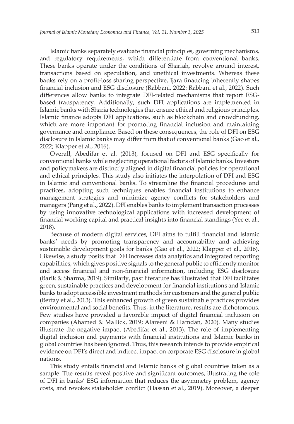 Penelitian ini meneliti dampak inklusi keuangan digital terhadap pengungkapan ESG perusahaan pada lembaga keuangan konvensional dan Islam.Hasil empiris menunjukkan bahwa inklusi fintech secara positif memengaruhi pengungkapan ESG bank karena terciptanya lingkungan informasi yang lebih baik, yang mendorong transparansi dan mengurangi asimetri informasi.Implementasi teknologi digital yang positif ini mendukung perilaku berkelanjutan bank dan institusi serta memperoleh sinyal positif dari pasar.