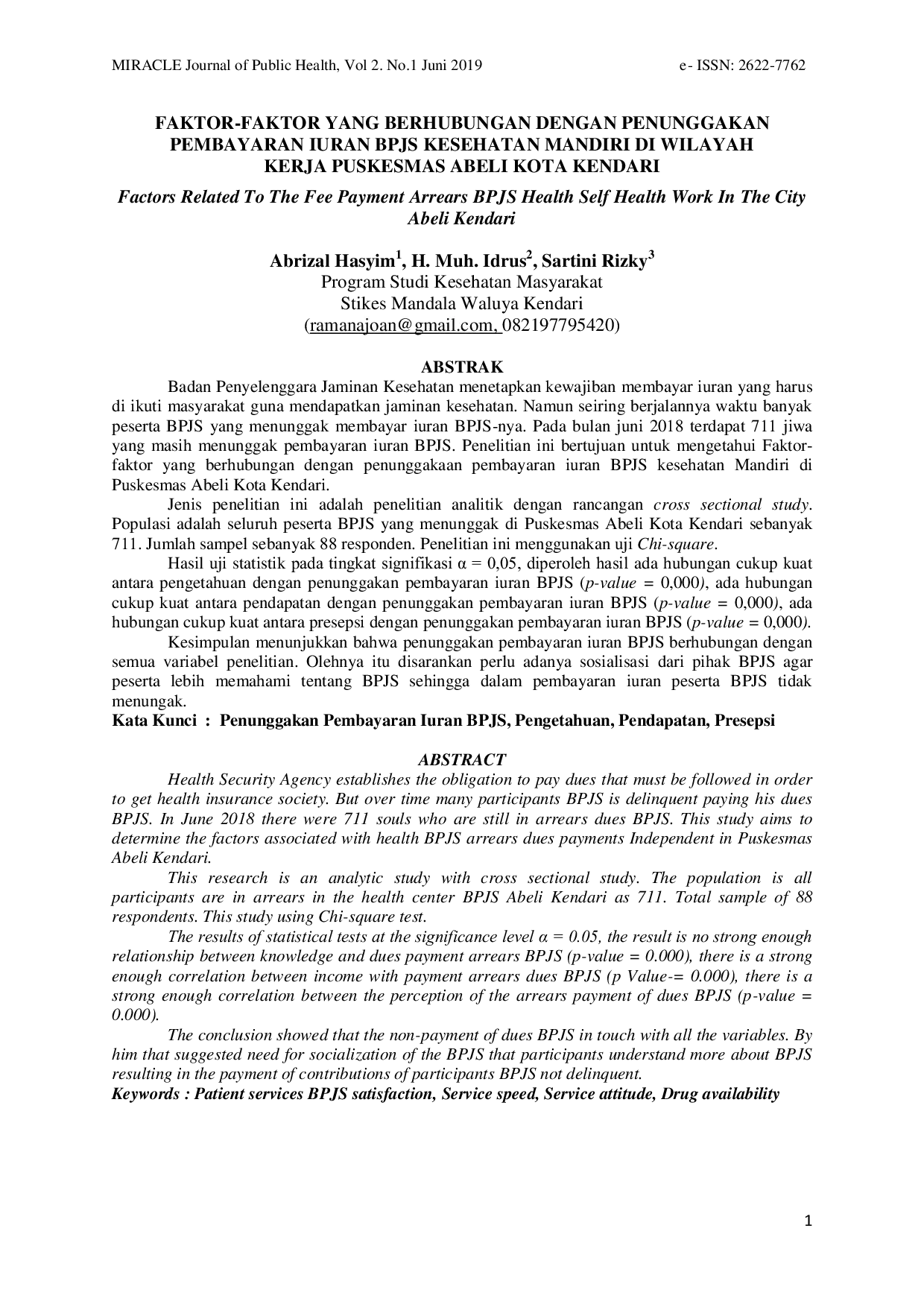 Miracle Journal of Public HealthMiracle Journal of Public HealthBadan Penyelenggara Jaminan Kesehatan menetapkan kewajiban membayar iuran yang harus di ikuti masyarakat guna mendapatkan jaminan kesehatan. Namun seiring berjalannya waktu banyak peserta BPJS yang menunggak membayar iuran BPJS-nya. Pada bulan Juni 2018 terdapat 711 jiwa yang masih menunggak pembayaran iuran BPJS. Penelitian ini bertujuan untuk mengetahui faktor-faktor yang berhubungan dengan penunggakan pembayaran iuran BPJS kesehatan mandiri di Puskesmas Abeli Kota Kendari. Jenis penelitian ini adalah penelitian analitik dengan rancangan cross sectional study. Populasi adalah seluruh peserta BPJS yang menunggak di Puskesmas Abeli Kota Kendari sebanyak 711. Jumlah sampel sebanyak 88 responden. Penelitian ini menggunakan uji Chi-square. Hasil uji statistik pada tingkat signifikasi α = 0,05, diperoleh hasil ada hubungan cukup kuat antara pengetahuan dengan penunggakan pembayaran iuran BPJS (p-value = 0,000), ada hubungan cukup kuat antara pendapatan dengan penunggakan pembayaran iuran BPJS (p-value = 0,000), ada hubungan cukup kuat antara persepsi dengan penunggakan pembayaran iuran BPJS (p-value = 0,000). Kesimpulan menunjukkan bahwa penunggakan pembayaran iuran BPJS berhubungan dengan semua variabel penelitian. Oleh karena itu disarankan perlu adanya sosialisasi dari pihak BPJS agar peserta lebih memahami tentang BPJS sehingga dalam pembayaran iuran peserta BPJS tidak menunggak.