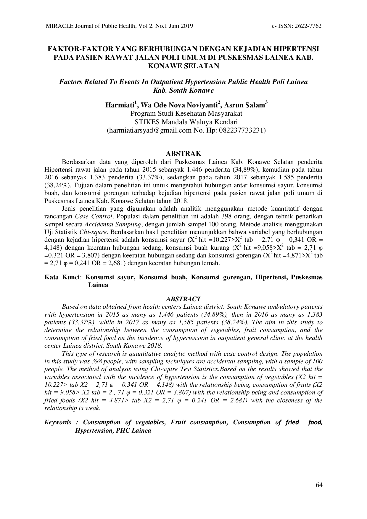 Miracle Journal of Public HealthMiracle Journal of Public HealthBerdasarkan data yang diperoleh dari Puskesmas Lainea Kab. Konawe Selatan penderita Hipertensi rawat jalan pada tahun 2015 sebanyak 1.446 penderita (34,89%), kemudian pada tahun 2016 sebanyak 1.383 penderita (33,37%), sedangkan pada tahun 2017 sebanyak 1.585 penderita (38,24%). Tujuan dalam penelitian ini untuk mengetahui hubungan antar konsumsi sayur, konsumsi buah, dan konsumsi gorengan terhadap kejadian hipertensi pada pasien rawat jalan poli umum di Puskesmas Lainea Kab. Konawe Selatan tahun 2018.