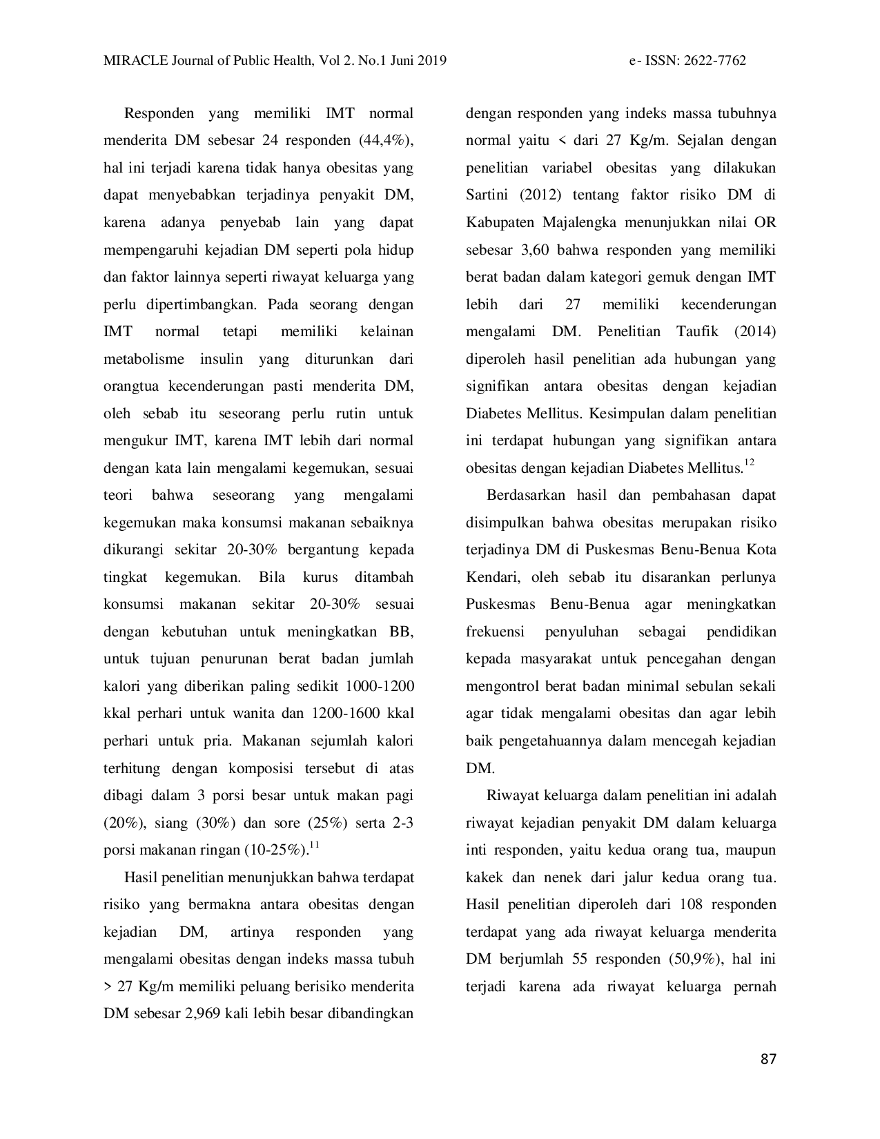 Miracle Journal of Public HealthMiracle Journal of Public HealthJumlah penderita Diabetes Mellitus Tipe II di wilayah Puskesmas Benu-Benua Kota Kendari mengalami peningkatan kasus pada tahun 2015 sebesar 1,70%, 2016 sebesar 1,72%, dan 2017 sebesar 1,75%. Target dan pencapaian pengobatan Diabetes Mellitus 100% - 60% belum optimal karena penderita diperoleh secara pasif. Tujuan penelitian ini adalah untuk mengetahui faktor risiko kejadian Diabetes Mellitus Tipe II di Puskesmas Benu-Benua Kota Kendari.