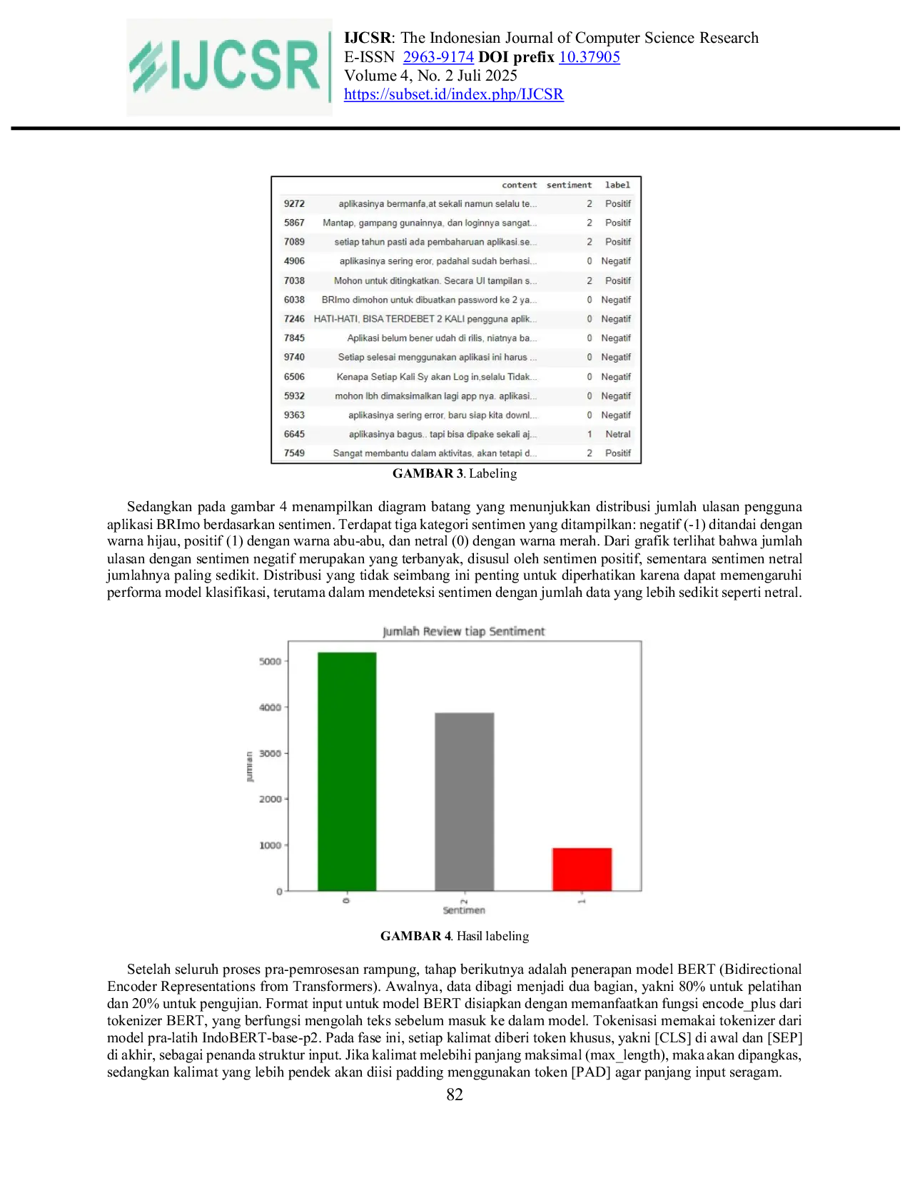 000 ulasan aplikasi BRImo melalui metode random sampling.Hasil pengujian menunjukkan bahwa model BERT mencapai akurasi 73% dan RNN-LSTM 70% setelah menghilangkan proses tokenisasi ganda.Kesimpulannya, model BERT lebih unggul dalam menangkap konteks bahasa Indonesia, terutama dalam menangani ambiguitas dan struktur kalimat kompleks dalam teks ulasan pengguna.