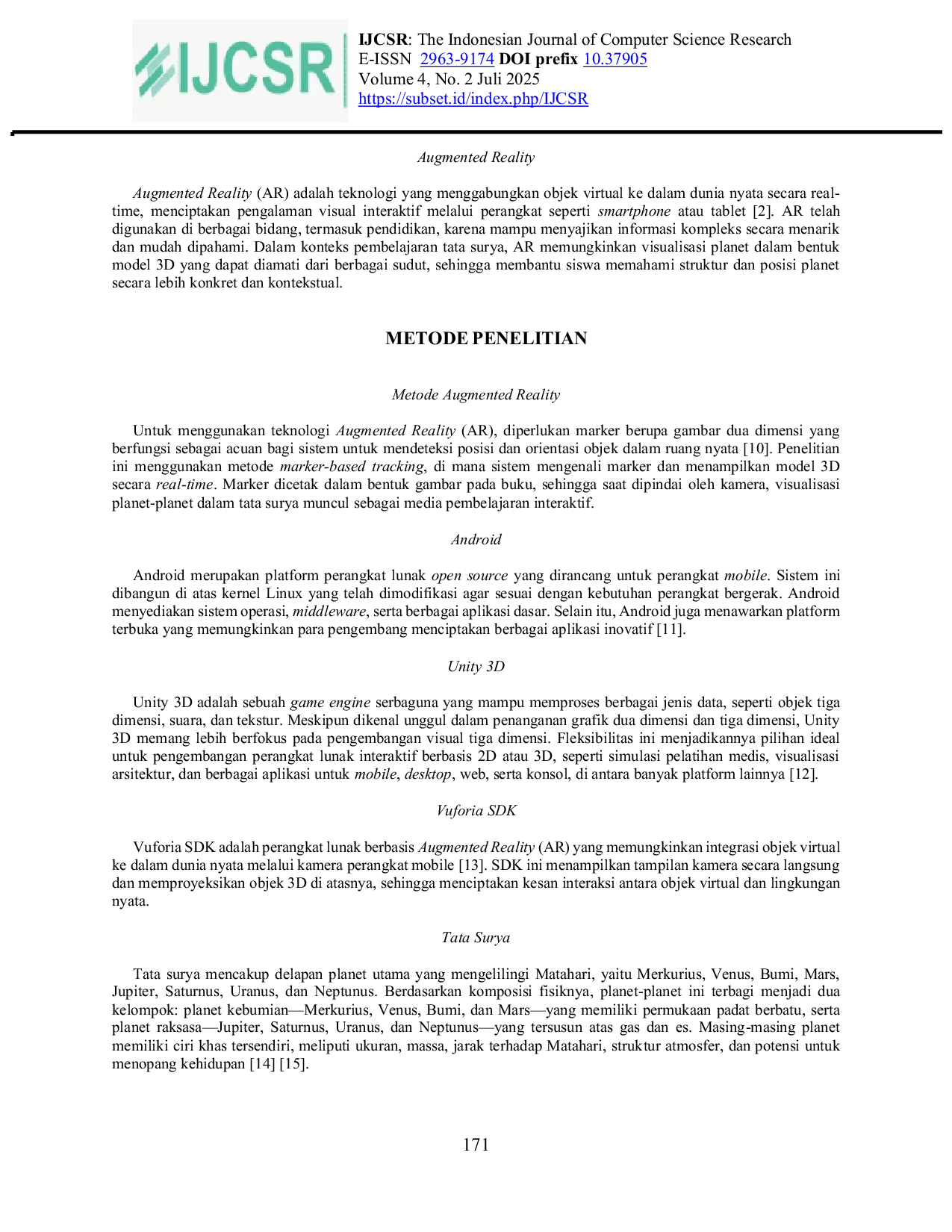 The Indonesian Journal of Computer Science ResearchThe Indonesian Journal of Computer Science ResearchPembelajaran konsep tata surya di sekolah dasar sering kali terkendala oleh keterbatasan media konvensional yang kurang mendukung pemahaman spasial dan visual siswa. Untuk mengatasi hal ini, penelitian ini bertujuan mengembangkan media pembelajaran interaktif berbasis Augmented Reality (AR) yang memungkinkan siswa berinteraksi langsung dengan visualisasi 3D planet dalam lingkungan nyata. Aplikasi dikembangkan menggunakan Unity 3D dan Vuforia SDK pada platform Android, dengan metode marker-based tracking untuk menampilkan model planet secara real-time saat marker discan. Hasil pengembangan menunjukkan aplikasi mampu menyajikan tampilan 3D planet yang informatif dan interaktif, dilengkapi narasi edukatif serta antarmuka yang mudah digunakan. Kesimpulan dari penelitian ini menunjukkan bahwa media pembelajaran berbasis AR dapat menjadi alternatif inovatif dan menarik dibanding metode konvensional, serta membantu meningkatkan pemahaman dan keterlibatan siswa. Secara aplikatif, media ini memiliki potensi besar untuk diterapkan dalam pembelajaran IPA di sekolah dasar, terutama untuk menjembatani konsep abstrak menjadi pengalaman belajar yang konkret dan menyenangkan.