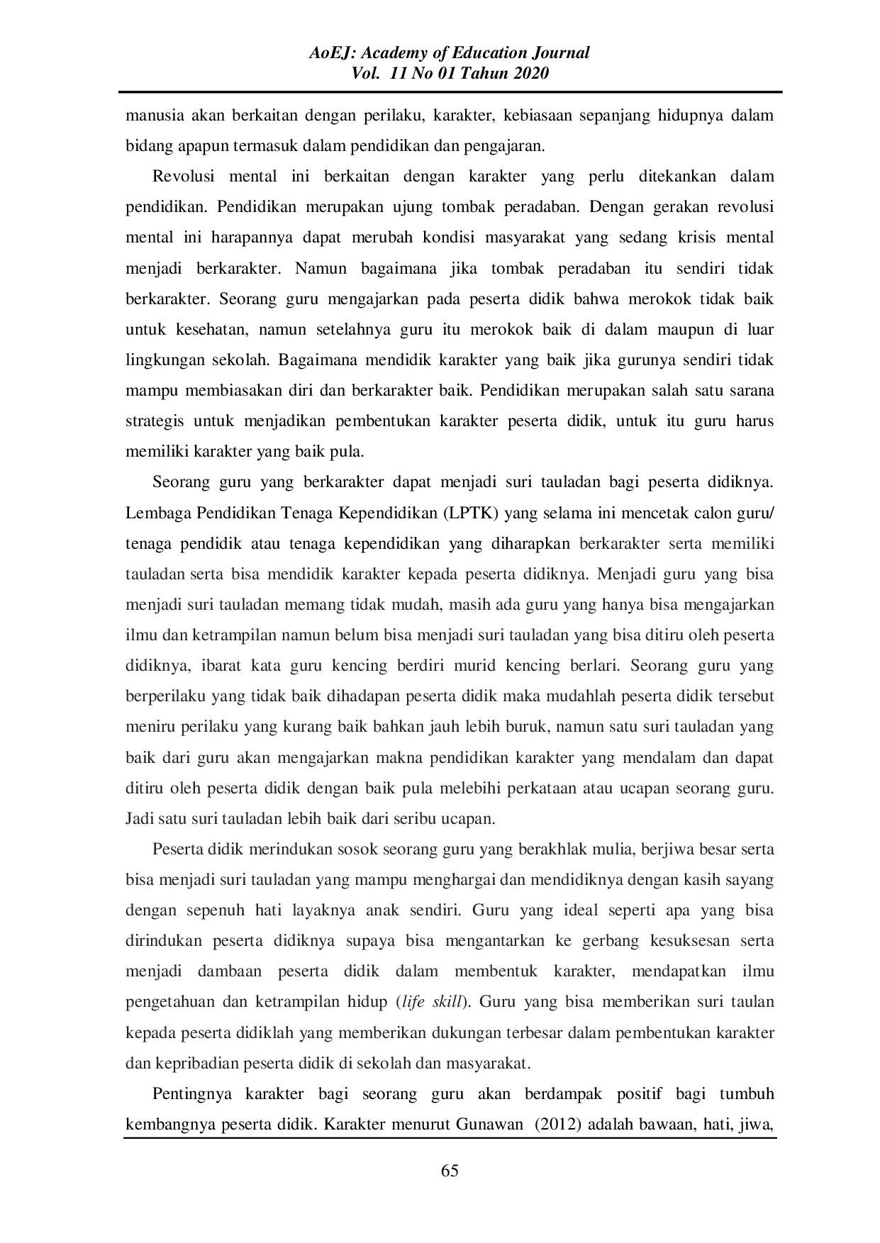 Academy of Education JournalAcademy of Education JournalPendidikan karakter dipengaruhi oleh peran guru yang berkarakter. Guru merupakan role model yang dijadikan panutan dan contoh nyata bagi peserta didik di sekolah maupun di masyarakat. Namun kenyataan di lapangan menunjukkan tidak semua guru mampu mendidik. Hal ini ditunjukkan dari maraknya kasus anmoral yang dilakukan oleh guru pada peserta didik seperti pelecehan seksual, kekerasan fisik, bullying, merokok di lingkungan sekolah, dan lain sebagainya. Guru yang tidak bermoral bisa menjadi faktor yang mempengaruhi bobroknya moral anak bangsa. Guru seharusnya dalam mendidik karakter haruslah lebih dahulu berkarakter yang baik sehingga dapat memberi contoh pada peserta didik. Ki Hadjar Dewantara menyatakan Ing Ngarsa Sung Tulada, Ing Madya Mangun Karsa, Tut Wuri Handayani. Istilah ini mengindikasikan bahwa guru merupakan contoh yang sangat berpengaruh terhadap pembentukan karakter. Bagaimana idealnya seorang guru yang berkarakter merupakan pertanyaan penting yang perlu dijawab oleh semua pendidik. Guru yang memiliki karakter ideal dapat berkontribusi terhadap pendidikan karakter peserta didik.