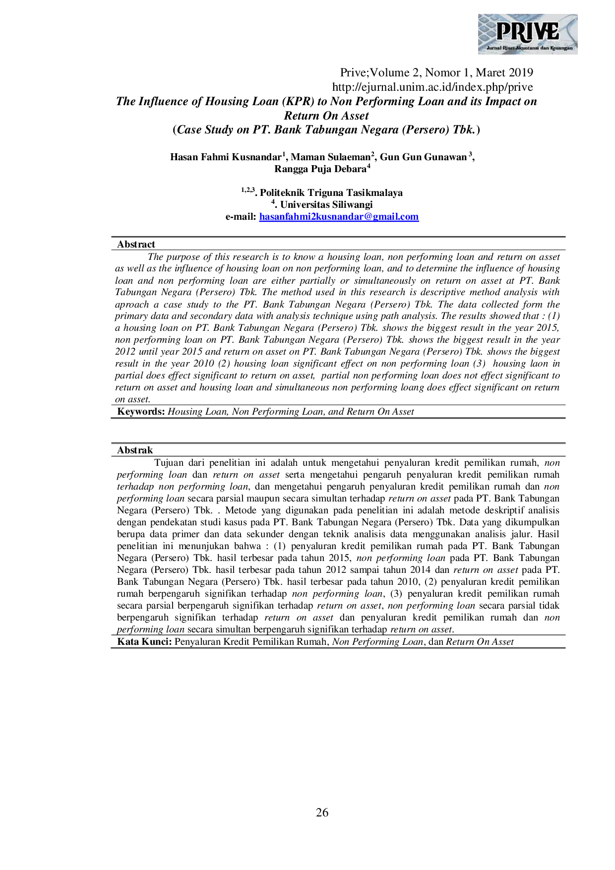 PRIVE: Jurnal Riset Akuntansi dan KeuanganPRIVE: Jurnal Riset Akuntansi dan KeuanganTujuan dari penelitian ini adalah untuk mengetahui penyaluran kredit pemilikan rumah, non performing loan dan return on asset serta mengetahui pengaruh penyaluran kredit pemilikan rumah terhadap non performing loan, dan mengetahui pengaruh penyaluran kredit pemilikan rumah dan non performing loan secara parsial maupun secara simultan terhadap return on asset pada PT. Bank Tabungan Negara (Persero) Tbk. Metode yang digunakan pada penelitian ini adalah metode deskriptif analisis dengan pendekatan studi kasus pada PT. Bank Tabungan Negara (Persero) Tbk. Data yang dikumpulkan berupa data primer dan data sekunder dengan teknik analisis data menggunakan analisis jalur. Hasil penelitian ini menunjukan bahwa : (1) penyaluran kredit pemilikan rumah pada PT. Bank Tabungan Negara (Persero) Tbk. hasil terbesar pada tahun 2015, non performing loan pada PT. Bank Tabungan Negara (Persero) Tbk. hasil terbesar pada tahun 2012 sampai tahun 2014 dan return on asset pada PT. Bank Tabungan Negara (Persero) Tbk. hasil terbesar pada tahun 2010, (2) penyaluran kredit pemilikan rumah berpengaruh signifikan terhadap non performing loan, (3) penyaluran kredit pemilikan rumah secara parsial berpengaruh signifikan terhadap return on asset, non performing loan secara parsial tidak berpengaruh signifikan terhadap return on asset dan penyaluran kredit pemilikan rumah dan non performing loan secara simultan berpengaruh signifikan terhadap return on asset.