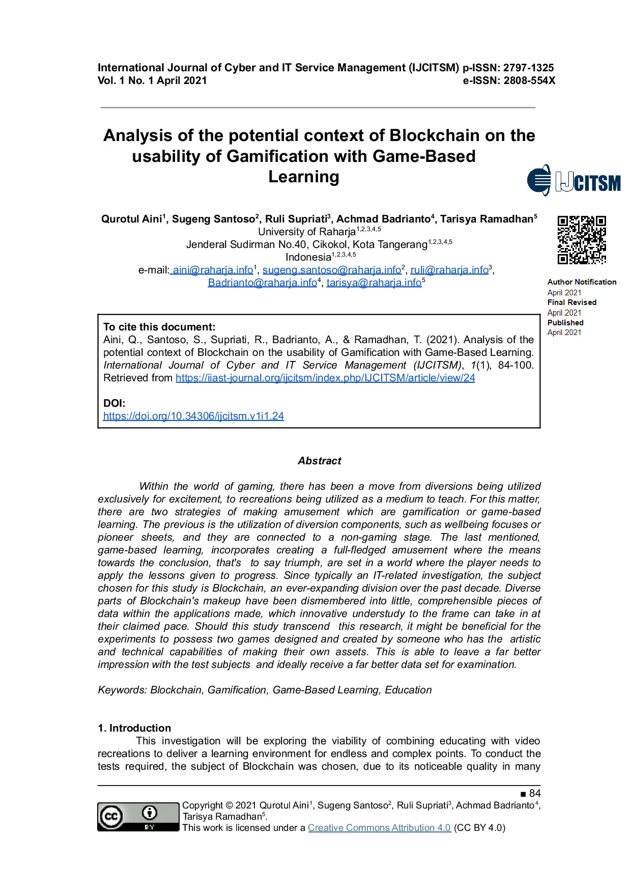 International Journal of Cyber and IT Service Management (IJCITSM)International Journal of Cyber and IT Service Management (IJCITSM)Dalam dunia permainan, telah terjadi pergeseran dari penggunaan hiburan semata hingga permainan sebagai media pembelajaran. Terdapat dua strategi dalam menciptakan hiburan, yaitu gamifikasi dan pembelajaran berbasis permainan. Gamifikasi memanfaatkan elemen-elemen permainan, seperti fokus kesejahteraan atau lembar kerja, dan menghubungkannya dengan tahap non-permainan. Sementara itu, pembelajaran berbasis permainan menciptakan permainan yang utuh, di mana cara mencapai kemenangan ditetapkan dalam dunia di mana pemain perlu menerapkan pelajaran yang diberikan untuk maju. Studi ini, yang merupakan investigasi terkait TI, memilih Blockchain sebagai subjek, sebuah bidang yang terus berkembang selama dekade terakhir. Berbagai komponen Blockchain telah dipecah menjadi potongan-potongan data yang mudah dipahami dalam aplikasi, yang memungkinkan peserta didik untuk mempelajarinya sesuai dengan kecepatan mereka. Jika studi ini melampaui penelitian ini, akan bermanfaat bagi para peneliti untuk memiliki dua permainan yang dirancang dan dibuat oleh seseorang yang memiliki kemampuan artistik dan teknis untuk membuat aset mereka sendiri. Hal ini dapat meninggalkan kesan yang jauh lebih baik pada subjek pengujian dan idealnya menerima set data yang jauh lebih baik untuk pemeriksaan.