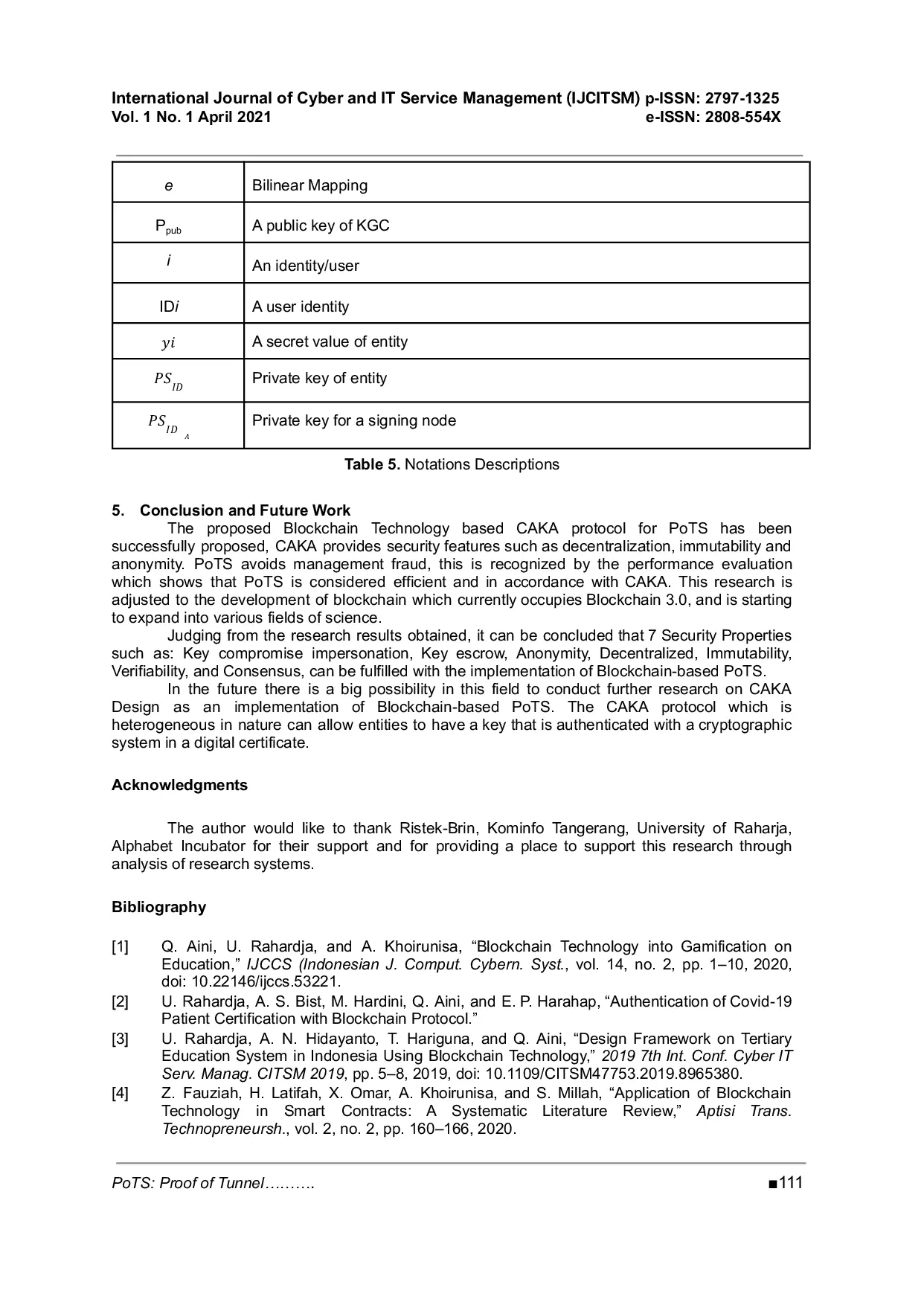 International Journal of Cyber and IT Service Management (IJCITSM)International Journal of Cyber and IT Service Management (IJCITSM)Proof of Tunnel Signature (PoTS) dirancang untuk menghindari masalah utama yang ditemukan dalam sertifikat berbasis teknologi Blockchain. Dalam konteks ini, PoTS sangat erat kaitannya dengan keamanan siber. Protokol ringan seperti Certificate Authenticated Key Agreement (CAKA) diperlukan untuk mengurangi kerentanan operasional sistem, yaitu dengan mengatasi overhead manajemen melalui penggunaan sistem terdesentralisasi sesuai karakteristik Teknologi Blockchain. PoTS merupakan tahap kedua setelah penentuan Key Agreement (KA) atau hash sertifikat dalam mengautentikasi sebuah node, dan ini juga merupakan langkah signifikan dalam meminimalkan biaya komputasi. Node-node yang dihasilkan setelah proses penandatanganan tetap anonim dan dapat diverifikasi secara optimal. Smart contract juga dimanfaatkan sebagai pendukung agar penelitian ini dapat menjamin transparansi dan keterbukaan node transaksi untuk menjaga dan meningkatkan efisiensi keamanan transaksi sertifikat berbasis Teknologi Blockchain.