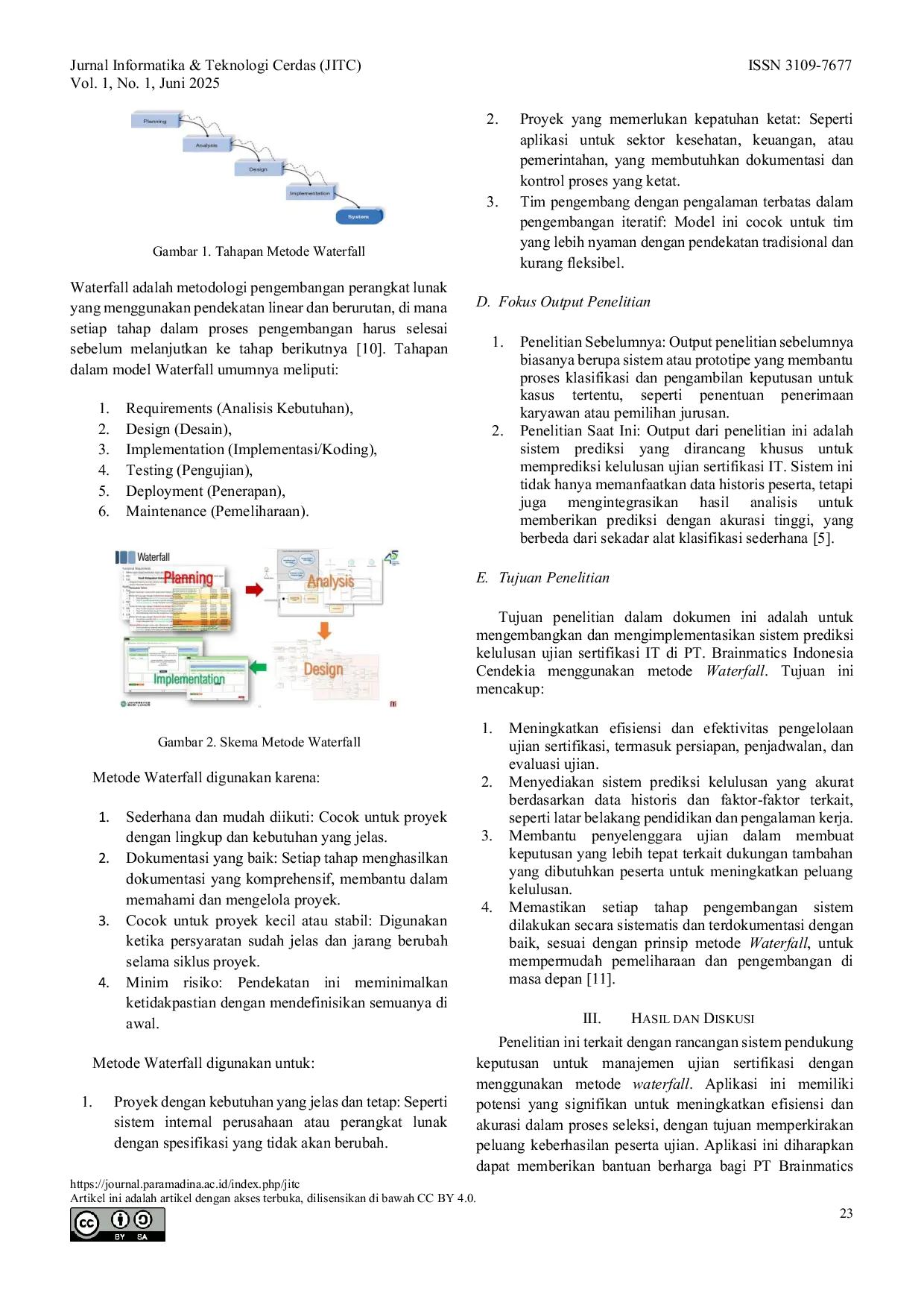 Jurnal Informatika & Teknologi CerdasJurnal Informatika & Teknologi CerdasPenelitian ini bertujuan mengembangkan sistem prediksi kelulusan ujian sertifikasi IT untuk meningkatkan kepercayaan diri peserta ujian dan mengidentifikasi peserta yang membutuhkan pelatihan tambahan di PT Brainmatics. Masalah muncul karena seringnya peserta yang kurang percaya diri untuk memulai sertifikasi, di lain sisi banyak yang tidak lulus karena terlalu percaya diri yang akan mempengaruhi rating dari Brainmatics. Penelitian menggunakan metode Waterfall karena pendekatannya yang sistematis dan terstruktur. Sistem prediksi ini memanfaatkan variabel seperti latar belakang pendidikan, pengalaman kerja, dan hasil tes sebelumnya. Tahapan pengembangan meliputi analisis kebutuhan, desain sistem, implementasi, pengujian, dan pemeliharaan. Hasil menunjukkan sistem mampu memberikan prediksi akurat dengan tingkat keandalan tinggi. Sistem ini membantu institusi pelatihan PT Brainmatics untuk mengidentifikasi peserta yang membutuhkan dukungan tambahan, serta meningkatkan kualitas pelatihan dan ujian sertifikasi IT.