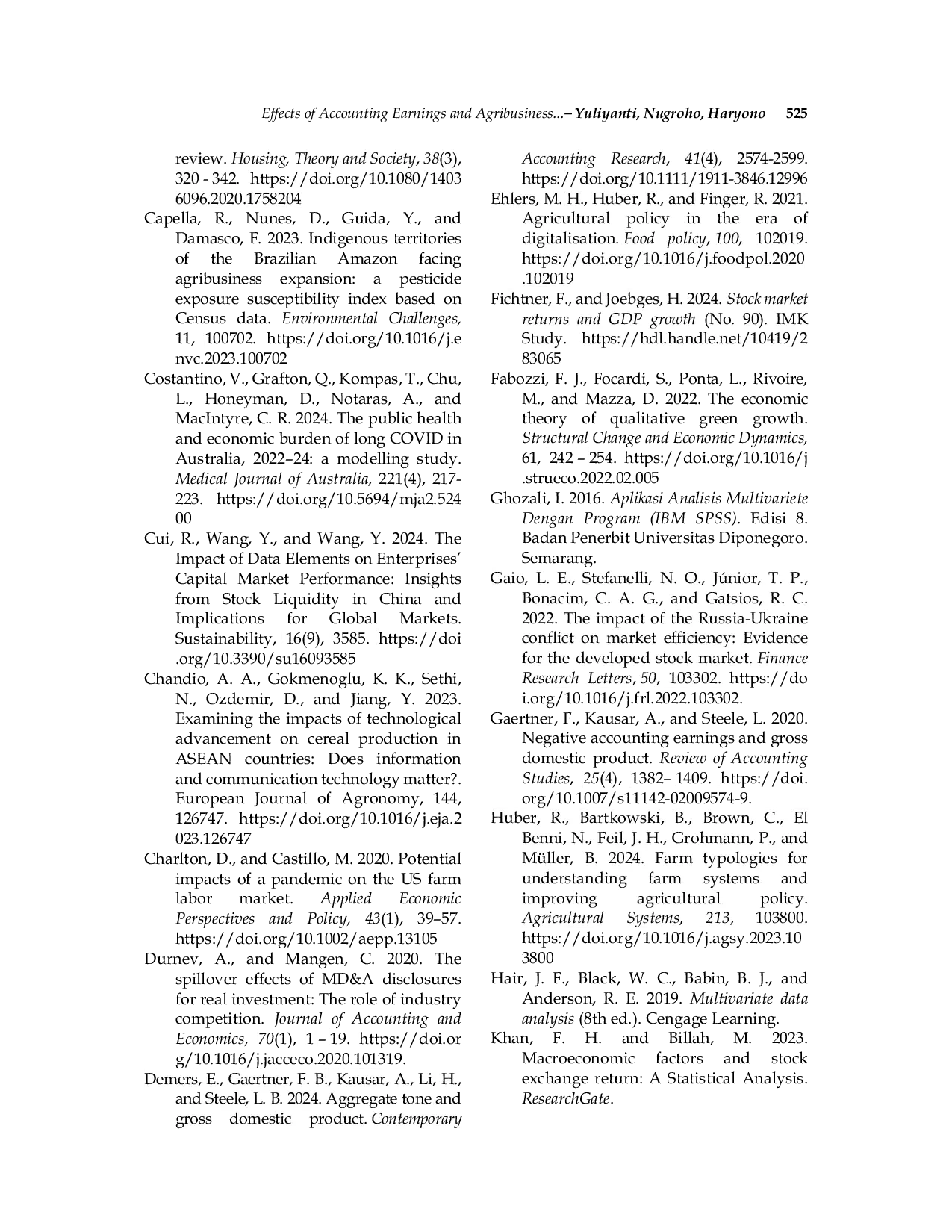 Penelitian selanjutnya dapat mengeksplorasi bagaimana kualitas institusional dan tata kelola memengaruhi peran mediasi AGDP antara accounting earnings dan pertumbuhan ekonomi, dengan menggunakan model panel data yang lebih luas. Selanjutnya, studi dapat meneliti dampak indikator keberlanjutan lingkungan, seperti intensitas karbon dan penggunaan air, terhadap hubungan kebijakan pertanian dan pertumbuhan ekonomi, memperpanjang rentang observasi hingga 2035 untuk menangkap dinamika jangka panjang. Terakhir, penelitian dapat mengkaji bagaimana tingkat digitalisasi agribisnis, termasuk adopsi pertanian presisi dan Internet of Things, memoderasi efek tidak langsung return pasar saham pada PDB melalui AGDP, menggunakan pendekatan structural equation modeling untuk mengungkap mekanisme kausal yang lebih kompleks.