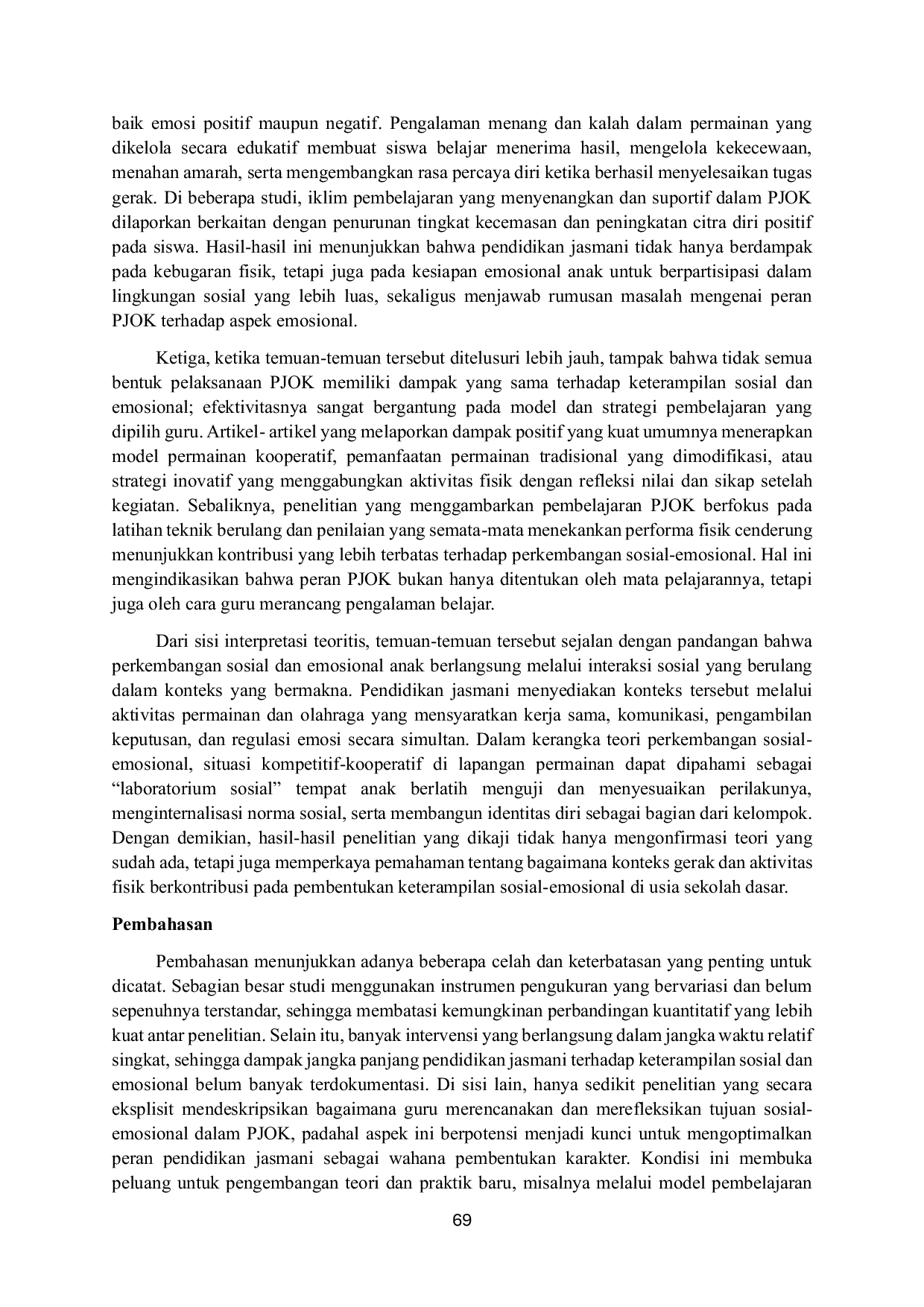 Pendidikan jasmani di sekolah dasar memiliki peran strategis sebagai wahana esensial untuk mengembangkan keterampilan sosial dan emosional siswa melalui interaksi fisik, khususnya permainan kooperatif dan olahraga beregu.Efektivitas pengembangan sosial‑emosional tidak bergantung pada jenis olahraga, melainkan pada intensi pedagogis guru yang mengintegrasikan refleksi nilai dalam kegiatan.Oleh karena itu, PJOK harus diposisikan kembali sebagai fondasi pendidikan karakter yang mengintegrasikan tubuh, emosi, dan interaksi sosial secara holistik.