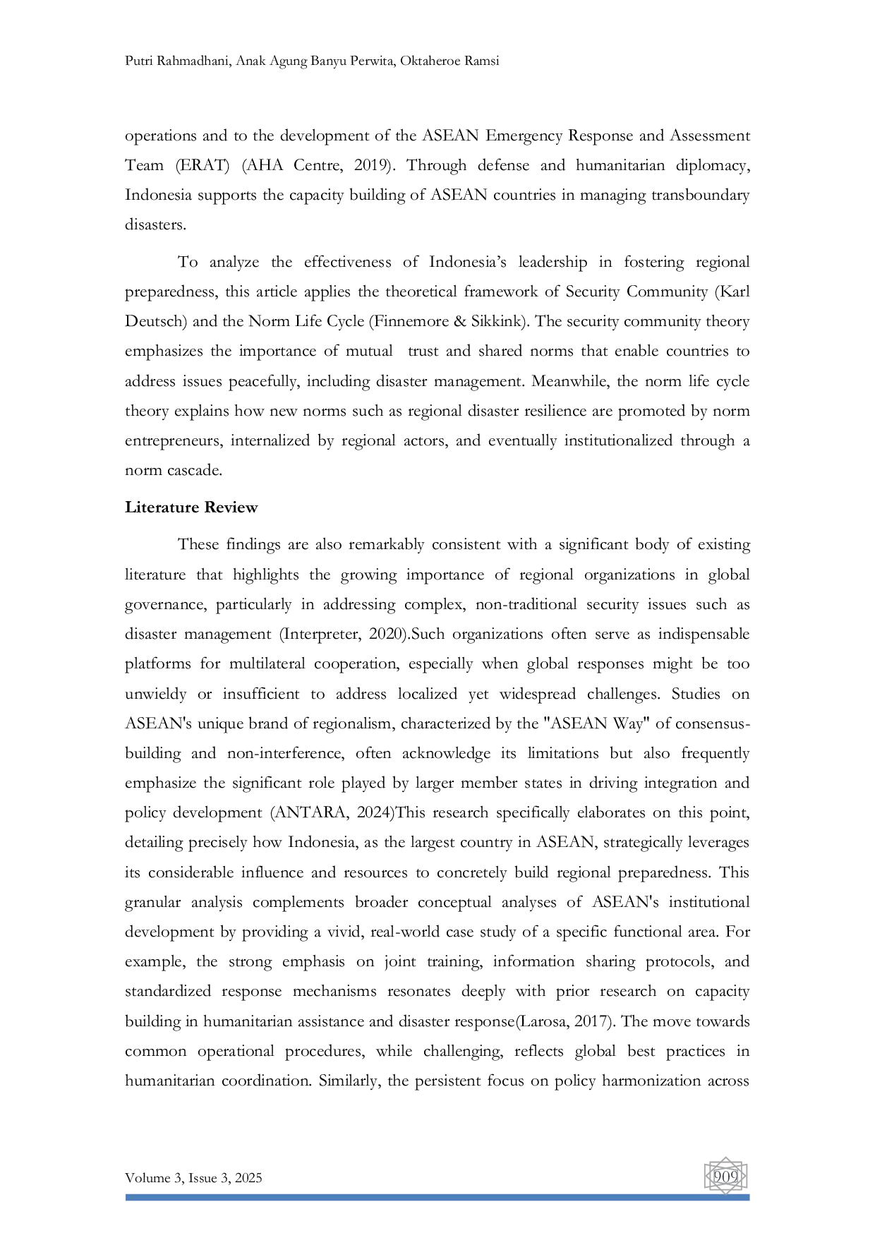 Penelitian ini mengkaji kepemimpinan Indonesia dalam meningkatkan kesiapsiagaan bencana regional melalui AHA Centre dengan menerapkan kerangka teori Komunitas Keamanan dan Siklus Hidup Norma, serta menunjukkan Indonesia berperan sebagai wirausahawan norma utama yang memupuk norma kooperatif dan memperkuat ketahanan ASEAN.Keterbatasan penelitian terletak pada pendekatan kualitatif yang tidak memberikan kesimpulan kuantitatif tentang dampak spesifik inisiatif Indonesia, serta kesulitan memperoleh data sensitif mengenai komitmen politik dan kontribusi keuangan masing‑masing anggota ASEAN.Oleh karena itu, penelitian selanjutnya disarankan untuk melakukan studi longitudinal terhadap program‑program yang dipimpin Indonesia, analisis komparatif tingkat komitmen politik antar negara anggota, serta menyelidiki strategi integrasi teknologi dan model pembiayaan berkelanjutan bagi mekanisme seperti AHA Centre.