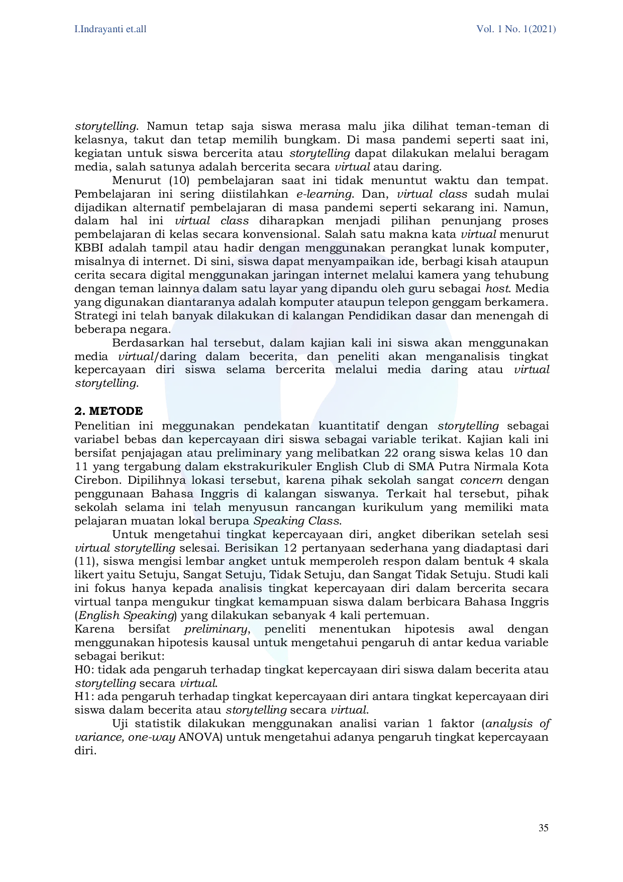 PARAVISUAL : Jurnal Desain Komunikasi Visual dan MultimediaPARAVISUAL : Jurnal Desain Komunikasi Visual dan MultimediaBercerita atau storytelling merupakan salah satu strategi dalam menyampaikan ide, cerita, atau hal apapun yang akan dituangkan dalam bentuk lisan diikuti beberapa gerakan tubuh. Namun, membutuhkan upaya yang sangat besar untuk dapat menyampaikan kisah ataupun bertukar cerita (storytelling) di kalangan siswa SMA di Indonesia karena masih merasa tidak percaya diri dan malu ditertawakan oleh teman-teman di kelasnya. Dalam kajian kali, ini siswa akan menggunakan media virtual/daring dalam becerita, dan peneliti akan menganalisis tingkat kepercayaan diri siswa selama bercerita melalui media daring atau virtual storytelling. Dengan melibatkan 22 orang siswa yang tergabung sebagai anggota eskul English Club, studi kali ini merupakan penelitian kuantitatif dengan analisis data menggunakan anova satu arah (One Way Anova) dan uji regresi untuk mengetahui pengaruh kedua variable yaitu virtual storytelling dan kepercayaan diri siswa. Berdasarkan hasil olah data, diketahui bahwa terdapat pengaruh tehadap kepercayaan diri siswa setelah bercerita secara virtual dengan nilai P-value adalah1.12 lebih besar dari nilai sig 0.05 atau 1.12>0.05. Hasil uji regresi diperoleh dengan nilai FSig 0.11 lebih besar dari nilai signifikansi 0.05 atau 0.11>0.05. Hal ini dapat disimpulkan bahwa pengaruh bercerita secara virtual terhadap tingkat kepercayaan diri siswa masih belum signifikan. Faktor psikologis adalah hal yang sangat dominan mempengaruhi.