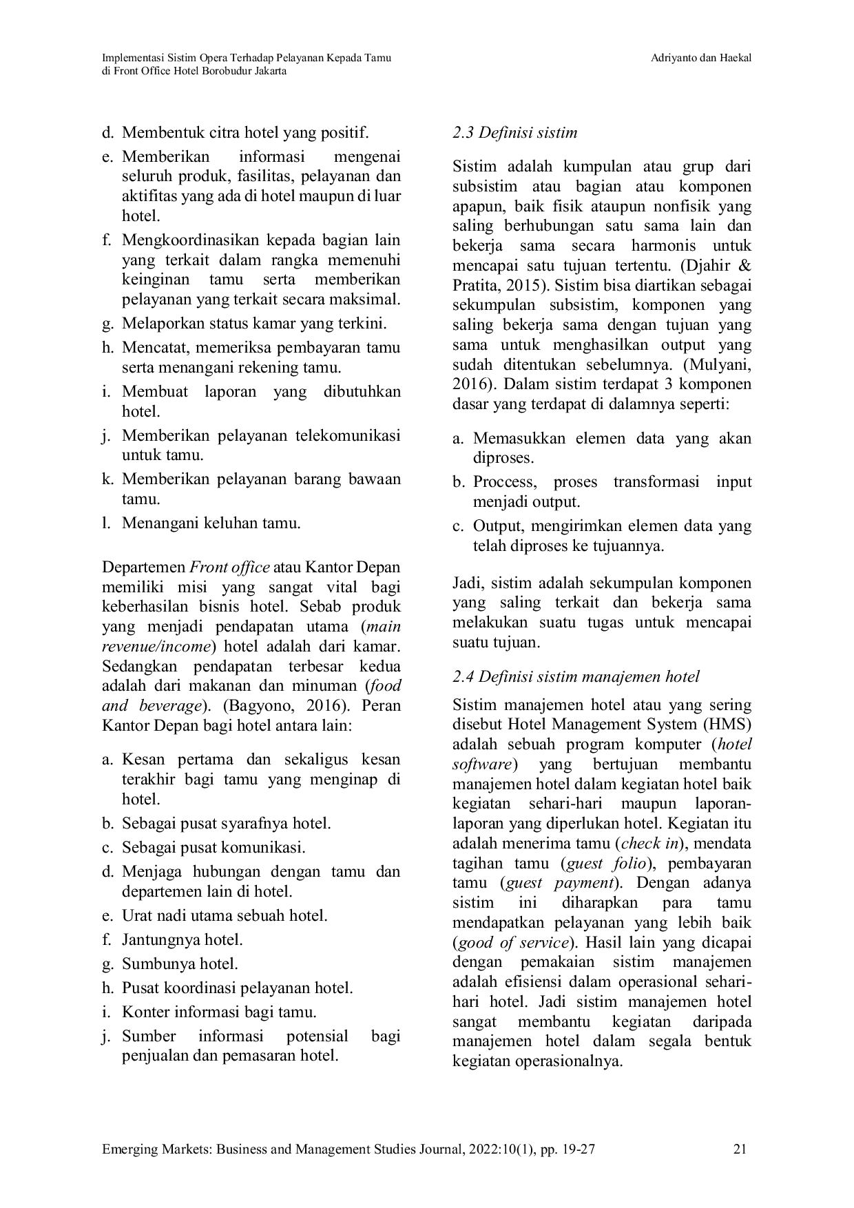 Emerging Markets : Business and Management Studies JournalEmerging Markets : Business and Management Studies JournalPenelitian ini fokus kepada sistim opera yang banyak digunakan sebagai hotel sistim pada banyak hotel, termasuk diantaranya adalah hotel Borobudur Jakarta. Sistim ini memberikan banyak fitur untuk proses check-in, tamu menginap hingga tamu check-out. Namun dalam perjalanannya banyak fitur-fitur yang tersedia tidak dapat dimanfaatkan secara maksimal oleh front desk agent yang menyebabkan pelayanan kepada tamu menjadi tidak maksimal. Di mana masih sangat tergantungnya front desk agent untuk mencari tahu lewat staf lain dibanding menggunakan fitur yang tersedia. Yang tentu saja berdampak pada pelayanan kepada tamu. Penelitian ini dilakukan di hotel Borobudur Jakarta. Teknik pengumpulan data dilakukan secara observasi dengan data yang didapatkan penulis dengan melakukan survey langsung dan diskusi dengan karyawan front office. Sedangkan sumber data didapatkan dengan metode studi kepustakaan dan media elektronik seperti internet. Hasil penelitian deskriptif menunjukkan bahwa front desk agent belum optimal dalam memanfaatkan seluruh fitur yang ada di sistim opera yang menyebabkan ketidakpuasan tamu terhadap pelayanan yang diberikan.
