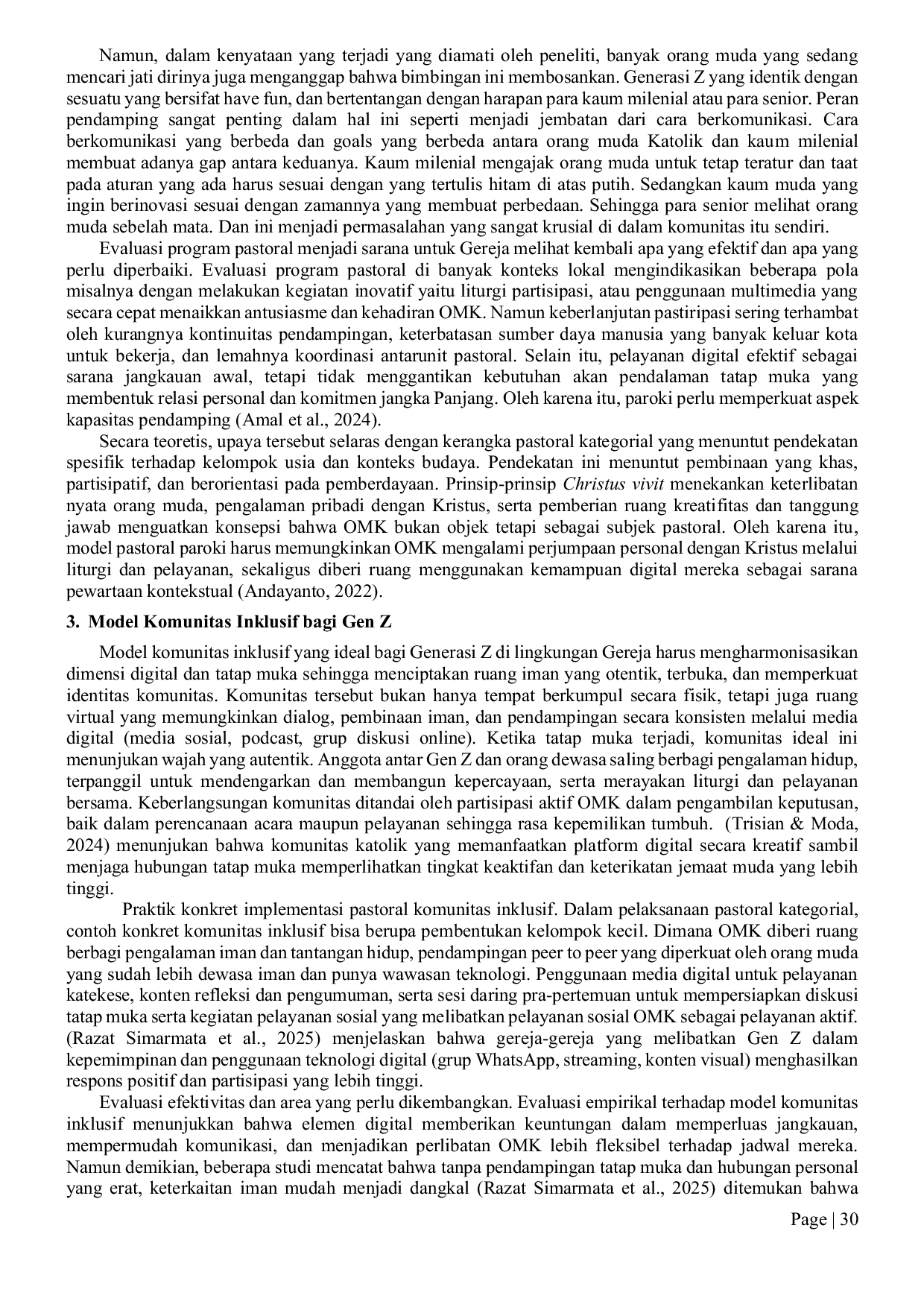 Penelitian ini menyimpulkan bahwa membangun komunitas Orang Muda Katolik (OMK) yang inklusif dan relevan bagi Generasi Z memerlukan harmonisasi strategi pastoral tatap muka dan digital untuk mengatasi individualisme serta modernisasi.OMK rentan terhadap relasi dangkal dan kurangnya partisipasi liturgi, sehingga model yang efektif harus mengedepankan otentisitas, pemberdayaan OMK sebagai subjek aktif, dan adaptasi media digital sebagai pelengkap.Meskipun ada upaya pastoral melalui kegiatan kebersamaan, keberlanjutan partisipasi OMK tetap menjadi kendala, menunjukkan perlunya transformasi peran Gereja menjadi mentor dan fasilitator yang partisipatif.