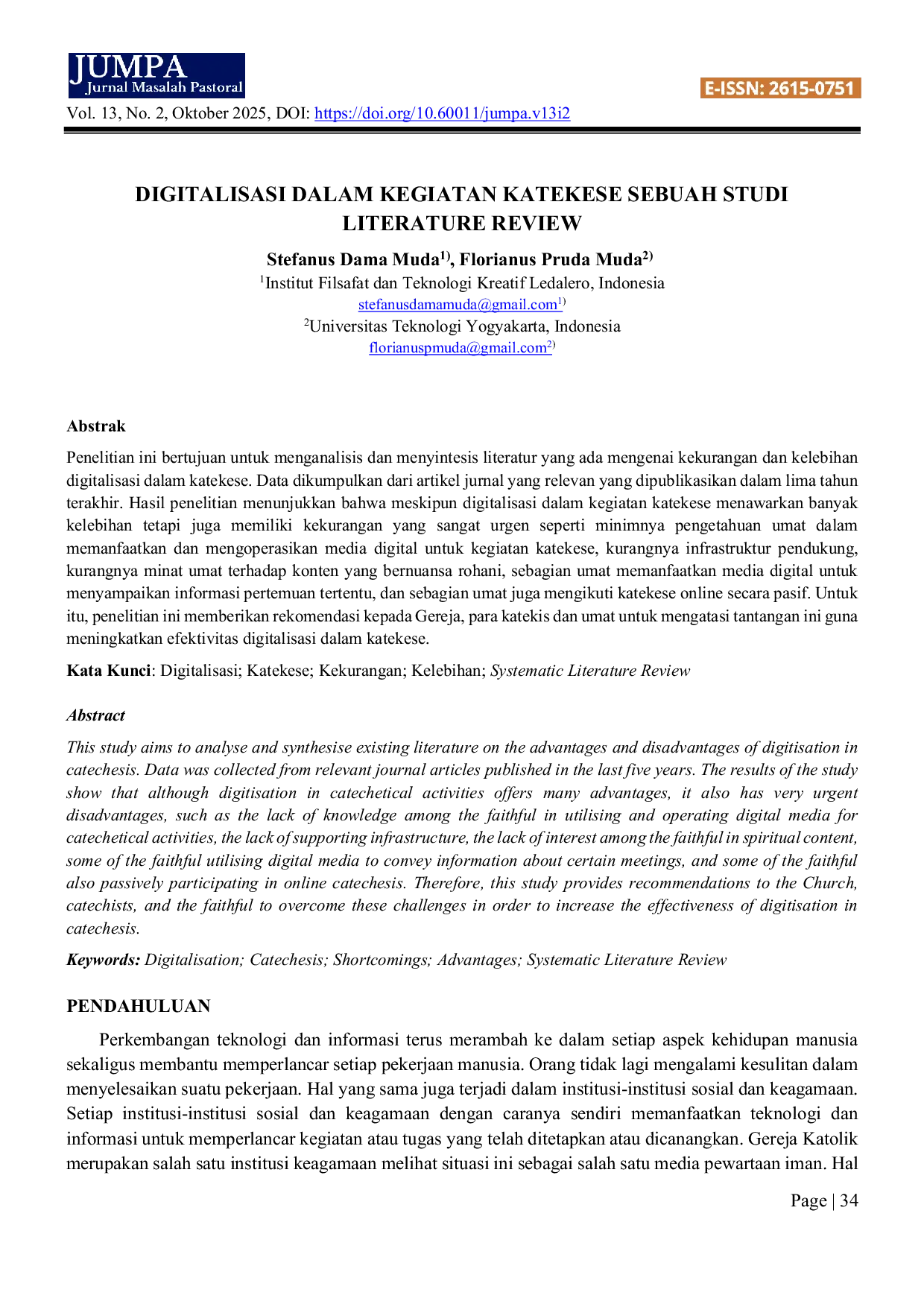 Jurnal Masalah Pastoral (JUMPA)Jurnal Masalah Pastoral (JUMPA)Penelitian ini bertujuan untuk menganalisis dan menyintesis literatur yang ada mengenai kekurangan dan kelebihan digitalisasi dalam katekese. Data dikumpulkan dari artikel jurnal yang relevan yang dipublikasikan dalam lima tahun terakhir. Hasil penelitian menunjukkan bahwa meskipun digitalisasi dalam kegiatan katekese menawarkan banyak kelebihan, tetapi juga memiliki kekurangan yang sangat urgen seperti minimnya pengetahuan umat dalam memanfaatkan dan mengoperasikan media digital untuk kegiatan katekese, kurangnya infrastruktur pendukung, kurangnya minat umat terhadap konten yang bernuansa rohani, sebagian umat memanfaatkan media digital untuk menyampaikan informasi pertemuan tertentu, dan sebagian umat juga mengikuti katekese online secara pasif. Untuk itu, penelitian ini memberikan rekomendasi kepada Gereja, para katekis dan umat untuk mengatasi tantangan ini guna meningkatkan efektivitas digitalisasi dalam katekese.