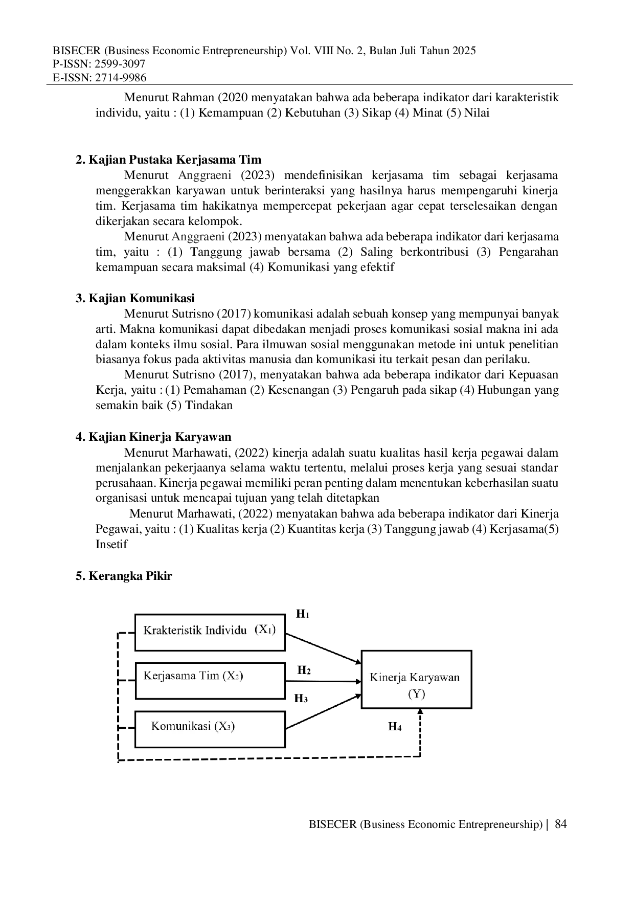 Penelitian ini menunjukkan bahwa karakteristik individu, kerja sama tim, dan komunikasi masing‑masing berpengaruh positif dan signifikan terhadap kinerja karyawan pada PT.Pinnacle Apparels, dengan nilai koefisien korelasi berkisar antara 0,468 hingga 0,530 dan nilai regresi positif.Ketiga variabel tersebut secara simultan menjelaskan sekitar 55,7 % varians kinerja karyawan, sementara sisanya dipengaruhi faktor lain di luar ruang lingkup penelitian.Hasil ini menegaskan pentingnya mengintegrasikan pengembangan sifat individu, kolaborasi tim, dan komunikasi efektif dalam strategi peningkatan produktivitas perusahaan.