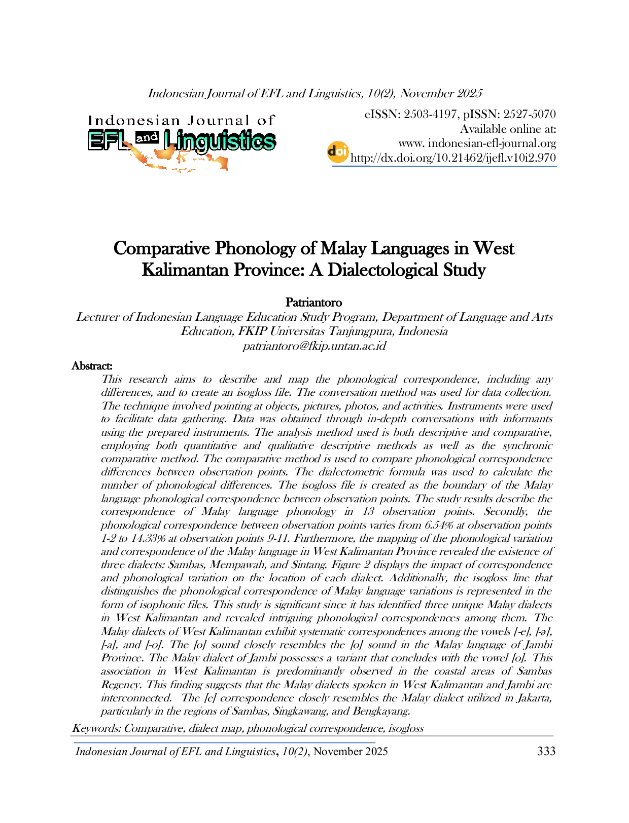Indonesian Journal of EFL and LinguisticsIndonesian Journal of EFL and LinguisticsPenelitian ini bertujuan untuk menggambarkan dan memetakan korespondensi fonologis, termasuk perbedaannya, serta menciptakan file isogloss. Metode percakapan digunakan untuk pengumpulan data. Teknik yang digunakan meliputi menunjuk objek, gambar, foto, dan aktivitas. Alat bantu digunakan untuk memfasilitasi pengumpulan data. Data diperoleh melalui percakapan mendalam dengan informan menggunakan instrumen yang disiapkan. Metode analisis yang digunakan adalah deskriptif dan komparatif, menggunakan metode deskriptif kuantitatif dan kualitatif serta metode komparatif sinkronik. Metode komparatif digunakan untuk membandingkan perbedaan korespondensi fonologis antara titik observasi. Rumus dialektometri digunakan untuk menghitung jumlah perbedaan fonologis. File isogloss dibuat sebagai batas korespondensi fonologis bahasa Melayu antara titik observasi. Hasil penelitian menggambarkan korespondensi fonologi bahasa Melayu di 13 titik observasi. Kedua, korespondensi fonologis antara titik observasi bervariasi dari 6,54% pada titik observasi 1-2 hingga 14,33% pada titik observasi 9-11. Selanjutnya, pemetaan variasi dan korespondensi fonologis bahasa Melayu di Provinsi Kalimantan Barat mengungkapkan adanya tiga dialek: Sambas, Mempawah, dan Sintang. Gambar 2 menampilkan dampak korespondensi dan variasi fonologis terhadap lokasi masing-masing dialek. Selain itu, garis isogloss yang membedakan korespondensi fonologis variasi bahasa Melayu direpresentasikan dalam bentuk file isofonik. Penelitian ini penting karena telah mengidentifikasi tiga dialek Melayu unik di Kalimantan Barat dan mengungkap korespondensi fonologis menarik di antara mereka.
