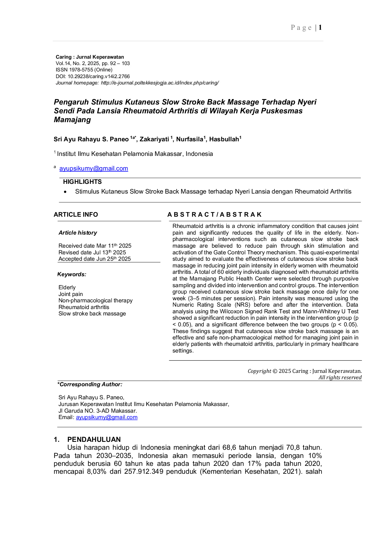 Caring : Jurnal KeperawatanCaring : Jurnal KeperawatanRheumatoid arthritis adalah kondisi inflamasi kronis yang menyebabkan nyeri sendi dan mengurangi kualitas hidup pada lansia. Intervensi non-farmakologis seperti cutaneous slow stroke back massage diyakini dapat mengurangi rasa sakit melalui stimulasi kulit dan aktivasi mekanisme teori gerbang kontrol. Penelitian quasi-eksperimental ini bertujuan mengevaluasi efektivitas cutaneous slow stroke back massage dalam mengurangi intensitas nyeri sendi pada lansia wanita dengan rheumatoid arthritis. Sebanyak 60 lansia dengan rheumatoid arthritis di Puskesmas Mamajang dipilih melalui purposive sampling dan dibagi menjadi kelompok intervensi dan kontrol. Kelompok intervensi menerima cutaneous slow stroke back massage sekali sehari selama satu minggu (3-5 menit per sesi). Intensitas nyeri diukur menggunakan Numeric Rating Scale (NRS) sebelum dan setelah intervensi. Analisis data menggunakan Wilcoxon Signed Rank Test dan Mann-Whitney U Test menunjukkan penurunan signifikan pada intensitas nyeri pada kelompok intervensi (p < 0.05) dan perbedaan signifikan antara kedua kelompok (p < 0.05). Temuan ini menunjukkan bahwa cutaneous slow stroke back massage adalah metode non-farmakologis yang efektif dan aman untuk mengelola nyeri sendi pada lansia dengan rheumatoid arthritis, terutama di fasilitas kesehatan primer.