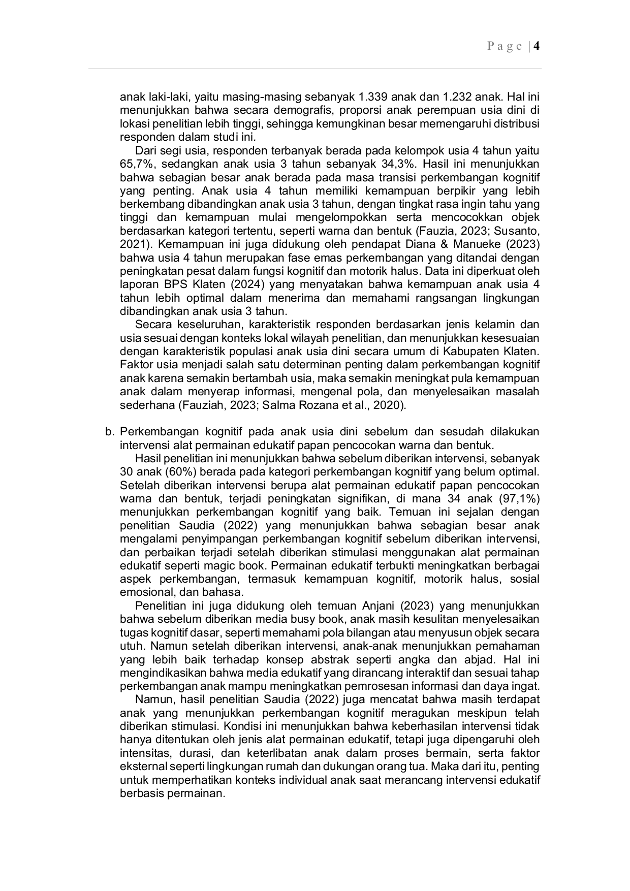 Penelitian selanjutnya dapat mengkaji efektivitas kombinasi berbagai jenis permainan edukatif dalam meningkatkan perkembangan kognitif anak usia dini secara lebih komprehensif. Selain itu, penelitian dapat dilakukan untuk mengeksplorasi pengaruh faktor-faktor sosial-ekonomi dan dukungan orang tua terhadap keberhasilan intervensi stimulasi kognitif pada anak usia dini. Pengembangan instrumen pengukuran perkembangan kognitif yang lebih sensitif dan adaptif terhadap konteks budaya lokal juga menjadi arah penelitian yang menjanjikan untuk memberikan gambaran yang lebih akurat tentang perkembangan kognitif anak.