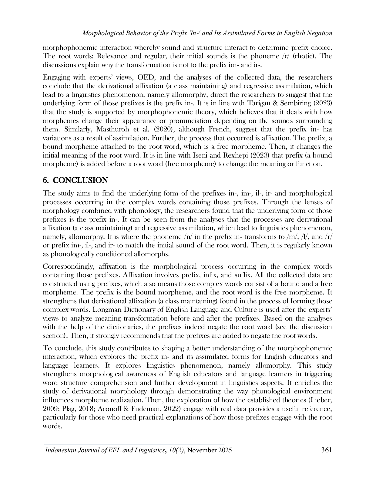 Penelitian lanjutan dapat dilakukan untuk menginvestigasi bagaimana pemahaman tentang proses morfologi, khususnya penggunaan awalan in- dan variasinya, berkorelasi dengan kemampuan menulis bahasa Inggris siswa. Selain itu, studi komparatif dapat dilakukan untuk membandingkan pemahaman dan penggunaan awalan negatif pada penutur asli dan bukan penutur asli bahasa Inggris. Penelitian lebih lanjut juga dapat mengeksplorasi bagaimana proses asimilasi fonologis dalam pembentukan kata memengaruhi pengajaran dan pembelajaran kosakata bahasa Inggris, khususnya bagi siswa yang memiliki latar belakang bahasa yang berbeda. Terakhir, penelitian dapat difokuskan pada analisis korpus besar untuk mengidentifikasi pola penggunaan awalan in- dan variasinya dalam berbagai konteks komunikasi, seperti teks akademik, media massa, dan percakapan sehari-hari, untuk memberikan wawasan yang lebih mendalam tentang bagaimana proses morfologi ini berfungsi dalam bahasa Inggris yang sebenarnya.