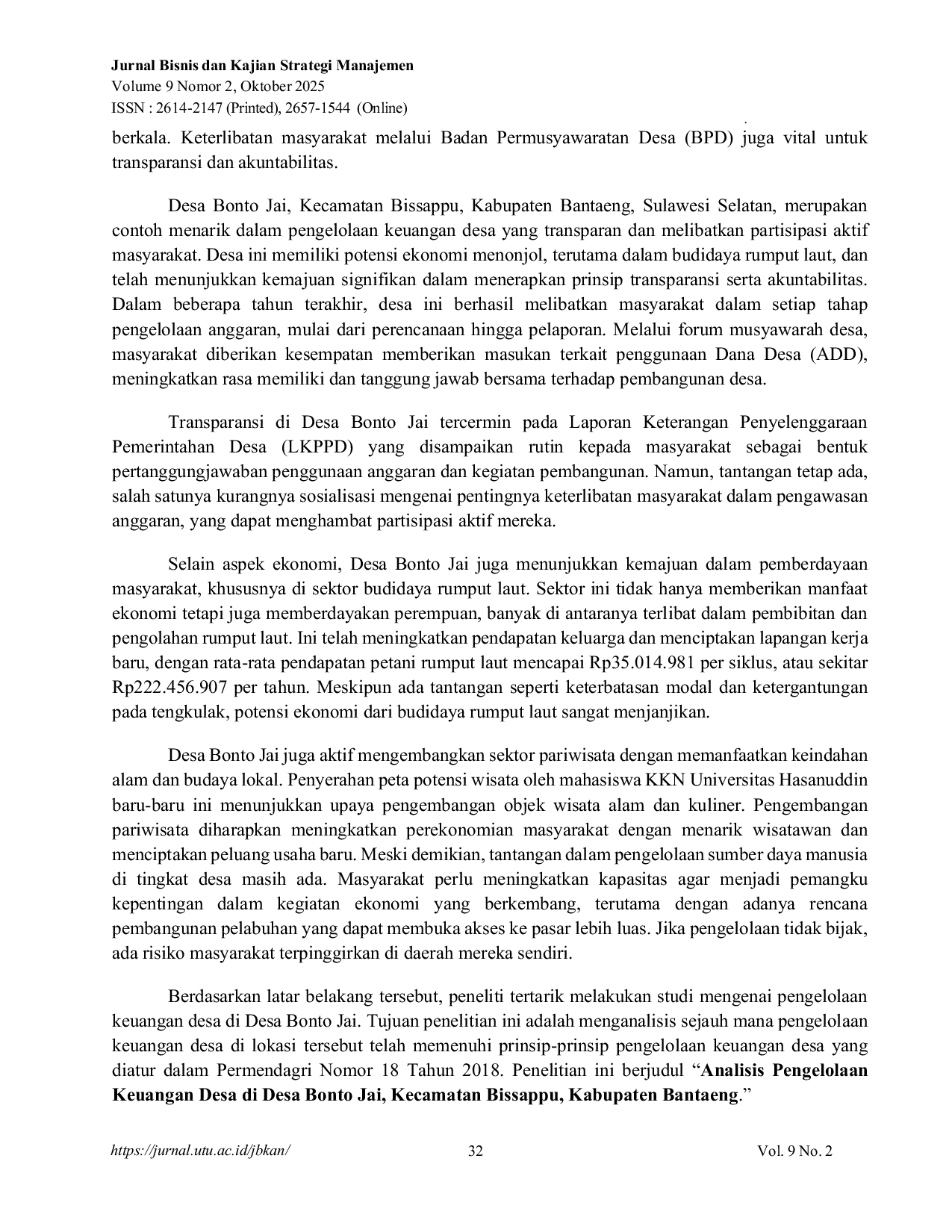 Jurnal Bisnis Dan Kajian Strategi ManajemenJurnal Bisnis Dan Kajian Strategi ManajemenThis study uses a qualitative approach to understand financial planning and management in Bonto Jai Village, Bissappu District, Bantaeng Regency. Data were collected through interviews, documentation, and observation, and analyzed inductively and comparatively. Informants included the Village Head, Village Secretary, and community representatives. The focus of the study was to describe phenomena related to village financial management and compare them with the Village Financial Management Guidelines according to Permendagri No. 20 of 2018. The results of the study showed that village financial management had followed the provisions and principles stipulated in Permendagri Number 20 of 2018. Bontojai Village has implemented stages of financial management which include planning involving community participation, transparently and accountably, implementation takes place from that supervision (BPD), and the Village Consultative Body accountability that is conveyed openly to the community.