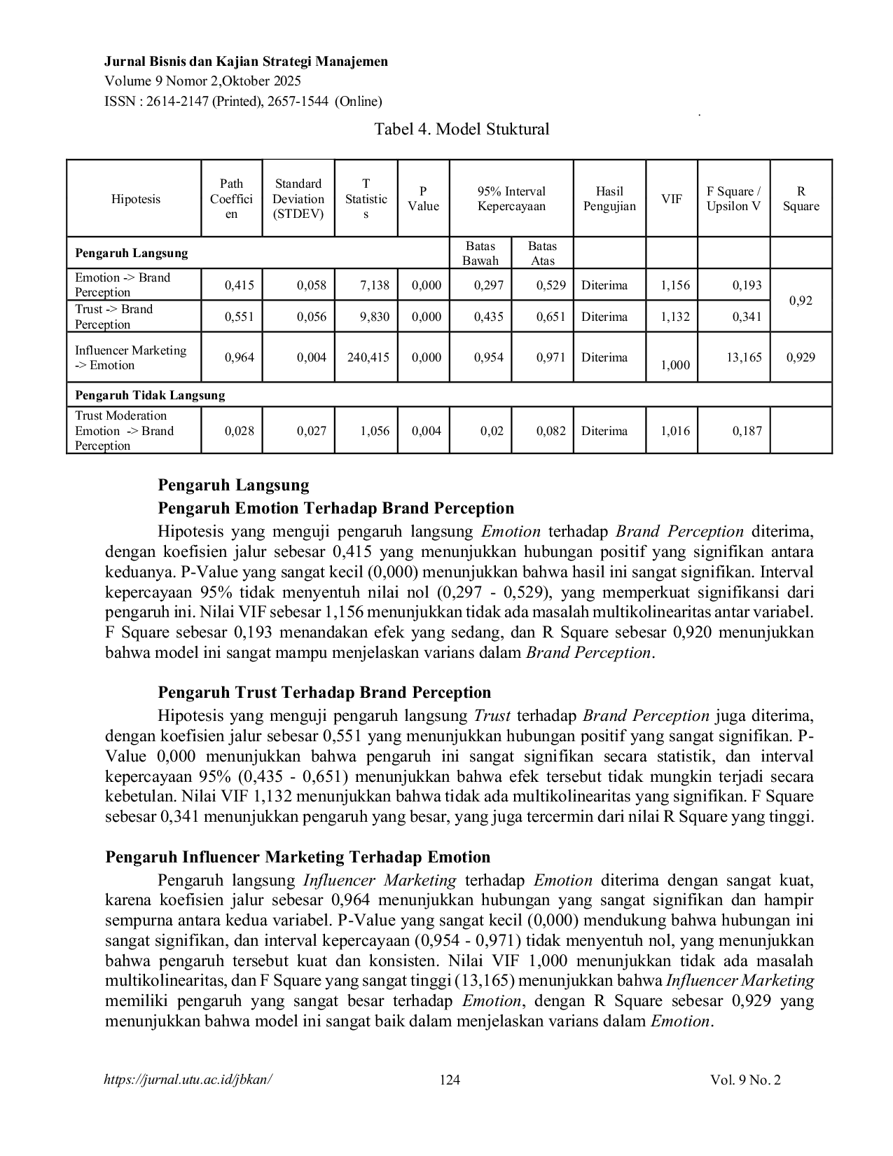 Influencer marketing secara signifikan meningkatkan emosi konsumen yang berujung pada persepsi merek yang lebih positif.kepercayaan konsumen terhadap influencer juga memberikan kontribusi signifikan terhadap persepsi merek dan berfungsi sebagai moderator yang memperkuat hubungan antara emosi dan persepsi merek.temuan ini menegaskan pentingnya membangun kepercayaan konsumen guna meningkatkan efektivitas strategi pemasaran influencer.