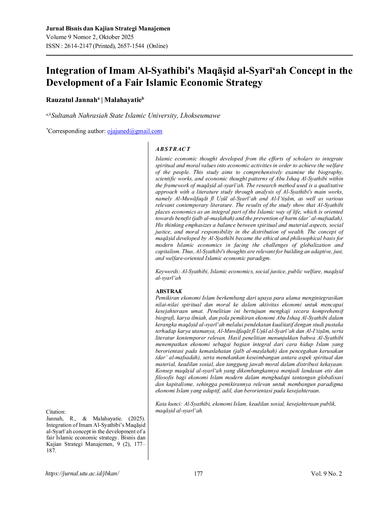 Jurnal Bisnis Dan Kajian Strategi ManajemenJurnal Bisnis Dan Kajian Strategi ManajemenIslamic economic thought developed from the efforts of scholars to integrate spiritual and moral values into economic activities in order to achieve the welfare of the people. This study aims to comprehensively examine the biography, scientific works, and economic thought patterns of Abu Ishaq Al-Syathibi within the framework of maqāṣid al-syarīah. The research method used is a qualitative approach with a literature study through analysis of Al-Syathibis main works, namely Al-Muwāfaqāt fī Uṣūl al-Syarīah and Al-Itiṣām, as well as various relevant contemporary literature. The results of the study show that Al-Syathibi places economics as an integral part of the Islamic way of life, which is oriented towards benefit (jalb al-maṣlahah) and the prevention of harm (dar al-mafsadah). His thinking emphasizes a balance between spiritual and material aspects, social justice, and moral responsibility in the distribution of wealth. The concept of maqāṣid developed by Al-Syathibi became the ethical and philosophical basis for modern Islamic economics in facing the challenges of globalization and capitalism. Thus, Al-Syathibis thoughts are relevant for building an adaptive, just, and welfare-oriented Islamic economic paradigm.