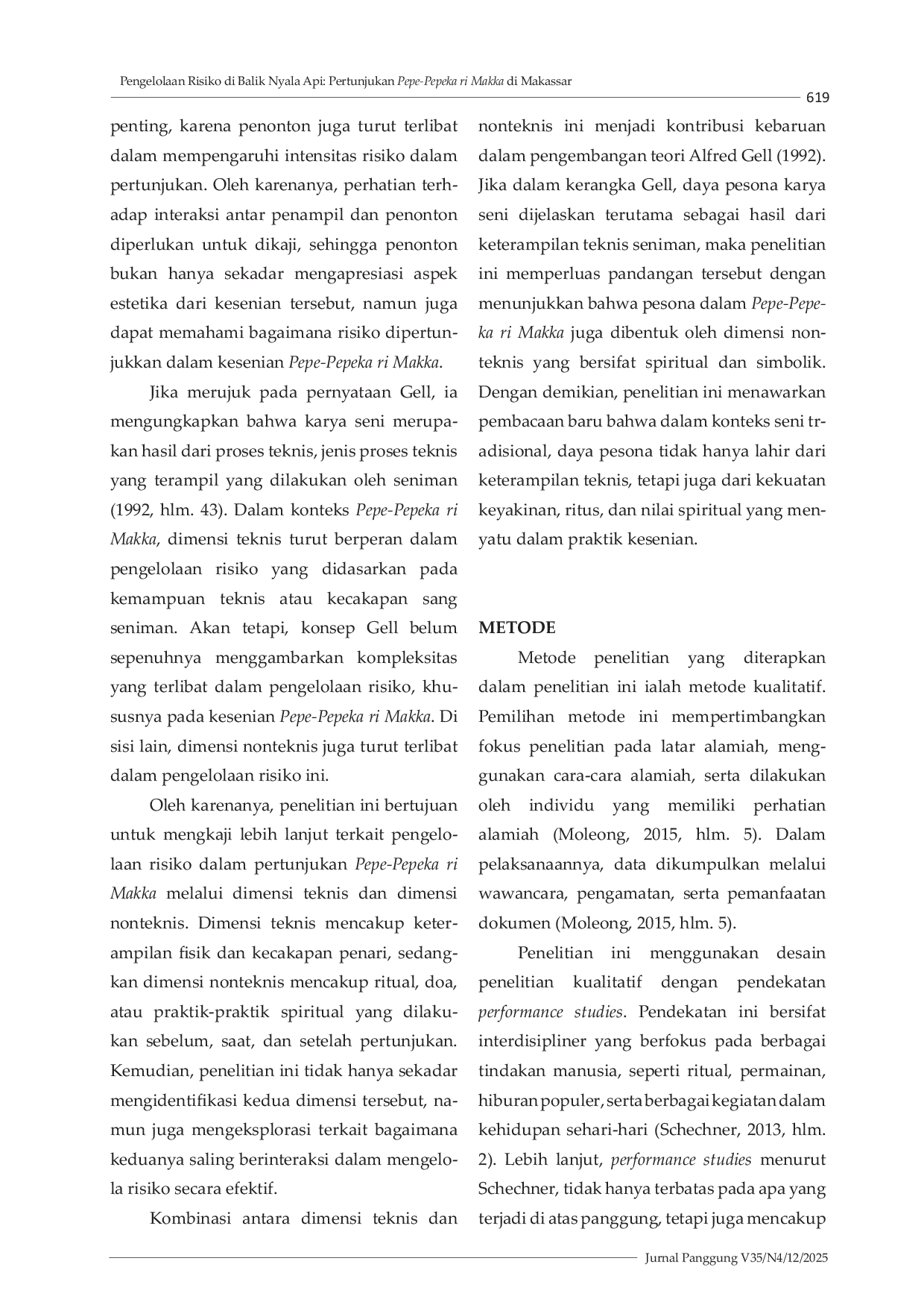 Penelitian ini mengidentifikasi beberapa kekurangan, terutama terbatasnya literatur dan studi sebelumnya mengenai dimensi nonteknis dalam pengelolaan risiko kesenian tradisional.Temuan menunjukkan bahwa dimensi teknis (keterampilan fisik, penguasaan gerak, dan teknik pengendalian api) dan dimensi nonteknis (ritual, doa, serta keyakinan spiritual) saling melengkapi untuk menjaga keselamatan penampil.Kombinasi kedua dimensi menciptakan keseimbangan antara kecakapan teknis dan keyakinan spiritual sebagai strategi pengelolaan risiko yang efektif.