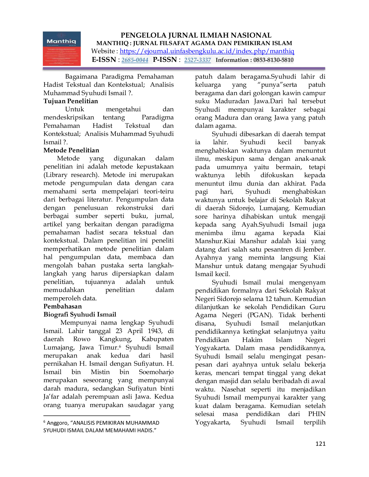Manthiq : Jurnal Filsafat Agama dan Pemikiran IslamManthiq : Jurnal Filsafat Agama dan Pemikiran IslamPenelitian ini menjelaskan tentang paradigma terhadap hadist tekstual dan kontekstual. Tokoh yang diteliti adalah Syuhudi Ismail, yang merupakan tokoh hadist di Indonesia dengan buku yang ditulis yaitu, Hadist Nabi yang Tekstual dan Kontekstual. Dalam memahami sebuah hadist, Syuhudi Ismail melakukannya dengan metode. Pertama, menganalisis teks. Kedua, mengidentifikasikan konteks historis munculnya hadist. Ketiga, kontekstualisasi hadist. Jenis penelitian yang digunakan dalam riset ini yakni menggunakan metode kepistakaan. Adapun sumber yang digunakan dalam penulisan ini adalah buku Hadist yang Tekstualis dan Kontekstualis serta buku lain atau artikel lain sebagai bahan pendukung dalam penelitian ini.