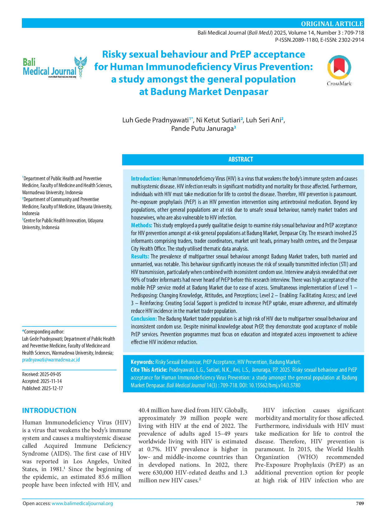 BMJBMJIntroduction: Human Immunodeficiency Virus (HIV) is a virus that weakens the bodys immune system and causes multisystemic disease. HIV infection results in significant morbidity and mortality for those affected. Furthermore, individuals with HIV must take medication for life to control the disease. Therefore, HIV prevention is paramount. Pre-exposure prophylaxis (PrEP) is an HIV prevention intervention using antiretroviral medication. Beyond key populations, other general populations are at risk due to unsafe sexual behaviour, namely market traders and housewives, who are also vulnerable to HIV infection. Methods: This study employed a purely qualitative design to examine risky sexual behaviour and PrEP acceptance for HIV prevention amongst at-risk general populations at Badung Market, Denpasar City. The research involved 25 informants comprising traders, trader coordinators, market unit heads, primary health centres, and the Denpasar City Health Office. The study utilised thematic data analysis. Results: The prevalence of multipartner sexual behaviour amongst Badung Market traders, both married and unmarried, was notable. This behaviour significantly increases the risk of sexually transmitted infection (STI) and HIV transmission, particularly when combined with inconsistent condom use. Interview analysis revealed that over 90% of trader informants had never heard of PrEP before this research interview. There was high acceptance of the mobile PrEP service model at Badung Market due to ease of access. Simultaneous implementation of Level 1 – Predisposing: Changing Knowledge, Attitudes, and Perceptions; Level 2 – Enabling: Facilitating Access; and Level 3 – Reinforcing: Creating Social Support is predicted to increase PrEP uptake, ensure adherence, and ultimately reduce HIV incidence in the market trader population. Conclusion: The Badung Market trader population is at high risk of HIV due to multipartner sexual behaviour and inconsistent condom use. Despite minimal knowledge about PrEP, they demonstrate good acceptance of mobile PrEP services. Prevention programmes must focus on education and integrated access improvement to achieve effective HIV incidence reduction.