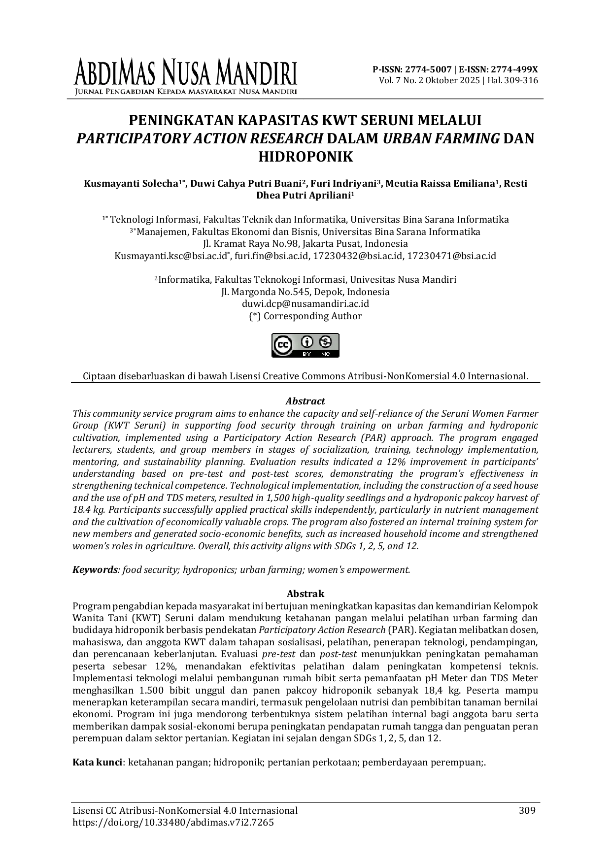 Jurnal AbdiMas Nusa MandiriJurnal AbdiMas Nusa MandiriProgram pengabdian kepada masyarakat ini bertujuan meningkatkan kapasitas dan kemandirian Kelompok Wanita Tani (KWT) Seruni dalam mendukung ketahanan pangan melalui pelatihan urban farming dan budidaya hidroponik berbasis pendekatan Participatory Action Research (PAR). Kegiatan melibatkan dosen, mahasiswa, dan anggota KWT dalam tahapan sosialisasi, pelatihan, penerapan teknologi, pendampingan, dan perencanaan keberlanjutan. Evaluasi pre-test dan post-test menunjukkan peningkatan pemahaman peserta sebesar 12%, menandakan efektivitas pelatihan dalam peningkatan kompetensi teknis. Implementasi teknologi melalui pembangunan rumah bibit serta pemanfaatan pH Meter dan TDS Meter menghasilkan 1.500 bibit unggul dan panen pakcoy hidroponik sebanyak 18,4 kg. Peserta mampu menerapkan keterampilan secara mandiri, termasuk pengelolaan nutrisi dan pembibitan tanaman bernilai ekonomi. Program ini juga mendorong terbentuknya sistem pelatihan internal bagi anggota baru serta memberikan dampak sosial-ekonomi berupa peningkatan pendapatan rumah tangga dan penguatan peran perempuan dalam sektor pertanian. Kegiatan ini sejalan dengan SDGs 1, 2, 5, dan 12.