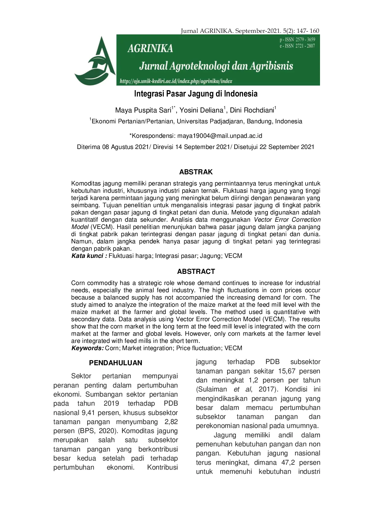 Jurnal Agrinika: Jurnal Agroteknologi dan AgribisnisJurnal Agrinika: Jurnal Agroteknologi dan AgribisnisKomoditas jagung memiliki peranan strategis yang permintaannya terus meningkat untuk kebutuhan industri, khususnya industri pakan ternak. Fluktuasi harga jagung yang tinggi terjadi karena permintaan jagung yang meningkat belum diiringi dengan penawaran yang seimbang. Tujuan penelitian untuk menganalisis integrasi pasar jagung di tingkat pabrik pakan dengan pasar jagung di tingkat petani dan dunia. Metode yang digunakan adalah kuantitatif dengan data sekunder. Analisis data menggunakan Vector Error Correction Model (VECM). Hasil penelitian menunjukan bahwa pasar jagung dalam jangka panjang di tingkat pabrik pakan terintegrasi dengan pasar jagung di tingkat petani dan dunia. Namun, dalam jangka pendek hanya pasar jagung di tingkat petani yang terintegrasi dengan pabrik pakan.