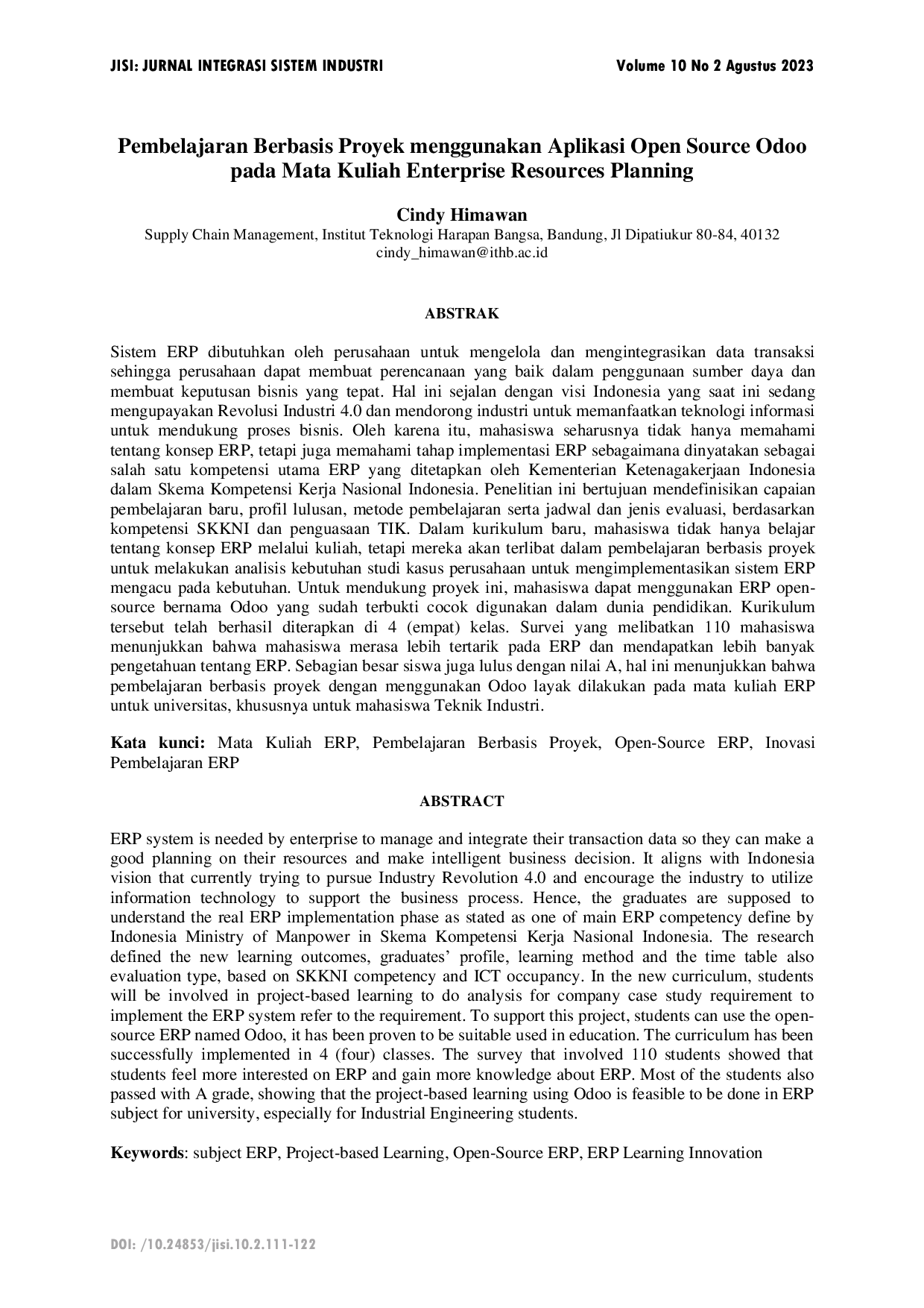 JISI: Jurnal Integrasi Sistem IndustriJISI: Jurnal Integrasi Sistem IndustriSistem ERP dibutuhkan oleh perusahaan untuk mengelola dan mengintegrasikan data transaksi sehingga perusahaan dapat membuat perencanaan yang baik dalam penggunaan sumber daya dan membuat keputusan bisnis yang tepat. Hal ini sejalan dengan visi Indonesia yang saat ini sedang mengupayakan Revolusi Industri 4.0 dan mendorong industri untuk memanfaatkan teknologi informasi untuk mendukung proses bisnis. Oleh karena itu, mahasiswa seharusnya tidak hanya memahami tentang konsep ERP, tetapi juga memahami tahap implementasi ERP sebagaimana dinyatakan sebagai salah satu kompetensi utama ERP yang ditetapkan oleh Kementerian Ketenagakerjaan Indonesia dalam Skema Kompetensi Kerja Nasional Indonesia. Penelitian ini bertujuan mendefinisikan capaian pembelajaran baru, profil lulusan, metode pembelajaran serta jadwal dan jenis evaluasi, berdasarkan kompetensi SKKNI dan penguasaan TIK. Dalam kurikulum baru, mahasiswa tidak hanya belajar tentang konsep ERP melalui kuliah, tetapi mereka akan terlibat dalam pembelajaran berbasis proyek untuk melakukan analisis kebutuhan studi kasus perusahaan untuk mengimplementasikan sistem ERP mengacu pada kebutuhan. Untuk mendukung proyek ini, mahasiswa dapat menggunakan ERP open-source bernama Odoo yang sudah terbukti cocok digunakan dalam dunia pendidikan. Kurikulum tersebut telah berhasil diterapkan di 4 (empat) kelas. Survei yang melibatkan 110 mahasiswa menunjukkan bahwa mahasiswa merasa lebih tertarik pada ERP dan mendapatkan lebih banyak pengetahuan tentang ERP. Sebagian besar siswa juga lulus dengan nilai A, hal ini menunjukkan bahwa pembelajaran berbasis proyek dengan menggunakan Odoo layak dilakukan pada mata kuliah ERP untuk universitas, khususnya untuk mahasiswa Teknik Industri.